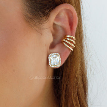 Brinco retângulo cristal entorno cravejado com banho de ouro 18k