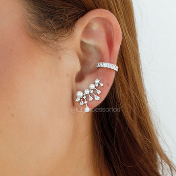 Brinco ear cuff pérolas e gotas cristal com banho de ródio branco