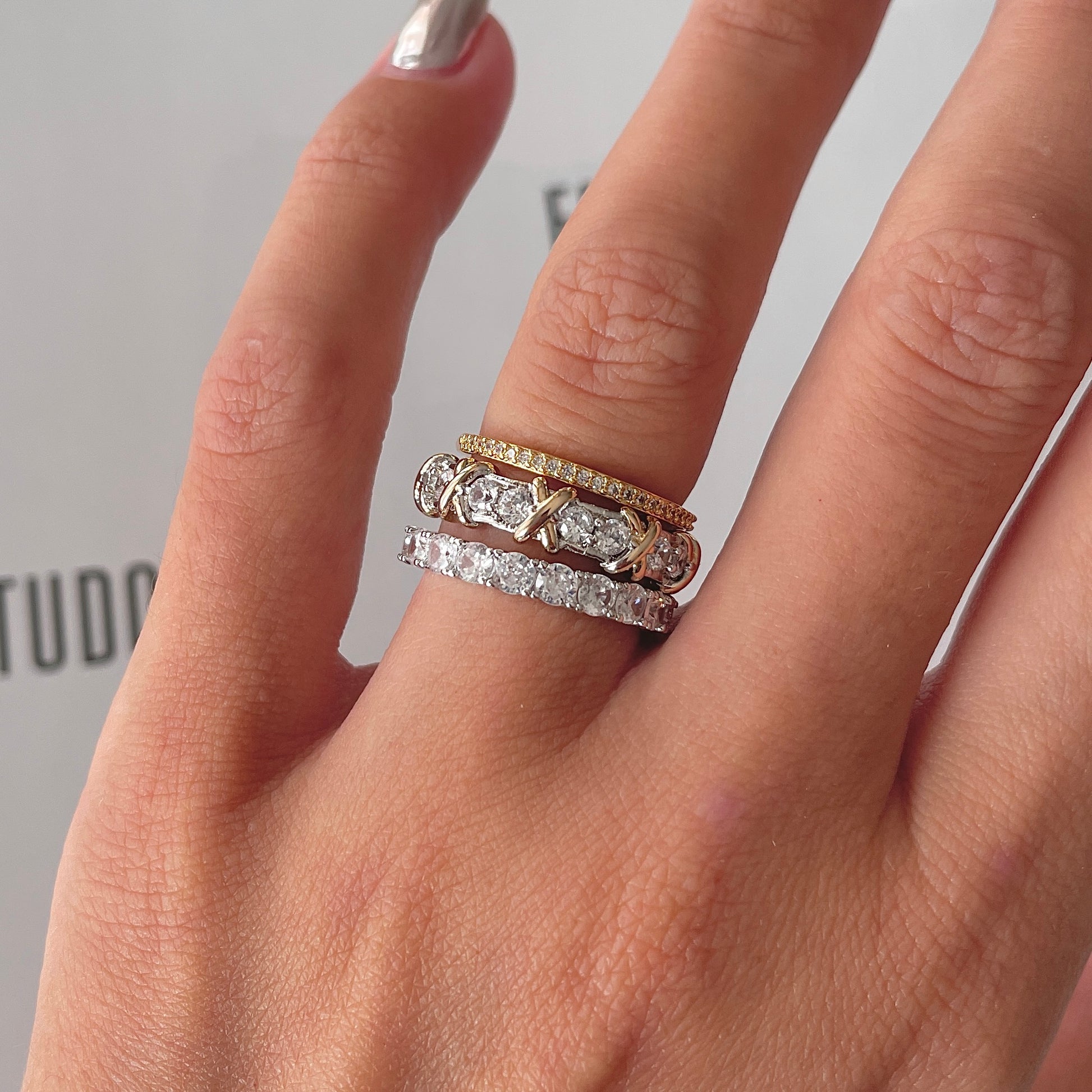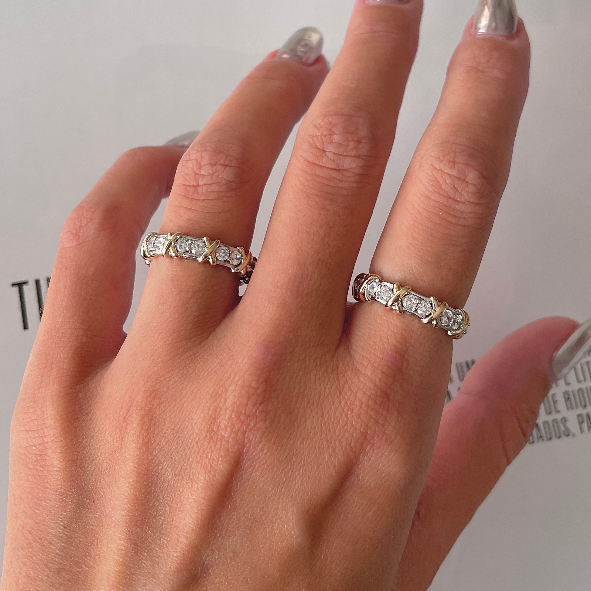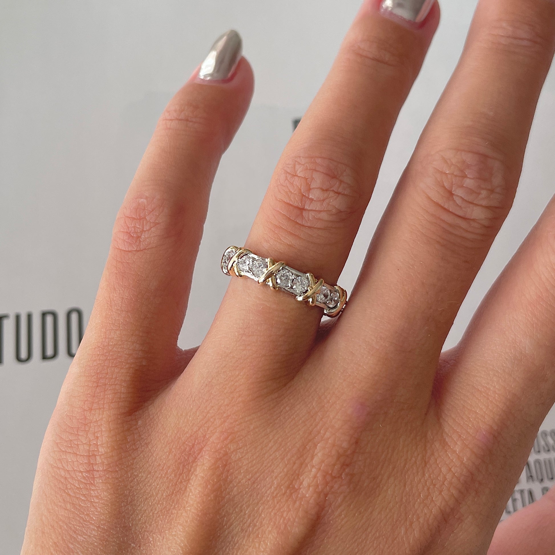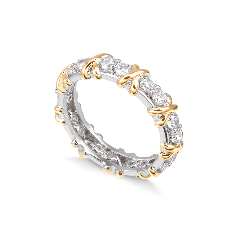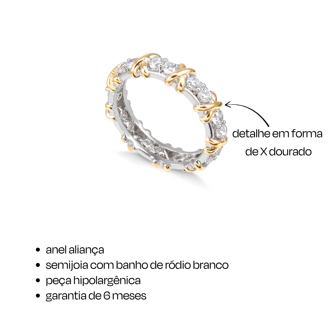 Exiba sua elegância com este Anel de Aliança cravejado com X dourado e banho de ródio branco. Perfeito para adicionar um toque de brilho ao seu visual, este anel é ideal para todas as ocasiões. Deixe a luz refletir em suas mãos com esta peça deslumbrante. Apenas X unidades disponíveis, garanta já o seu!