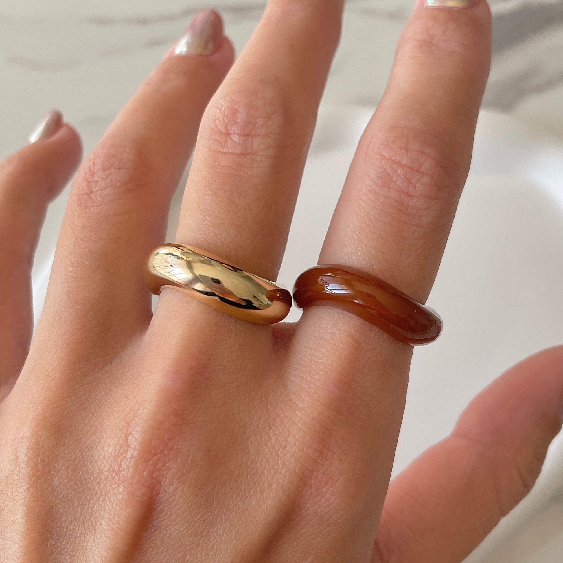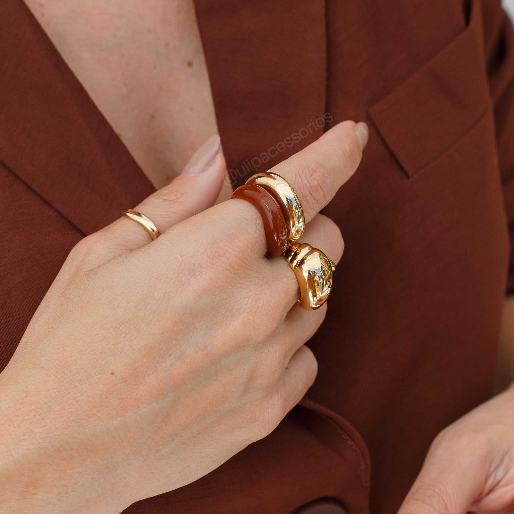 Este anel duplo ondulado combina o charme do dourado com detalhes em marrom, realçado por um banho de ouro 18k. Seu design moderno e elegante é perfeito para destacar seu estilo com sofisticação, tornando-se um acessório indispensável para ocasiões especiais ou para o dia a dia.