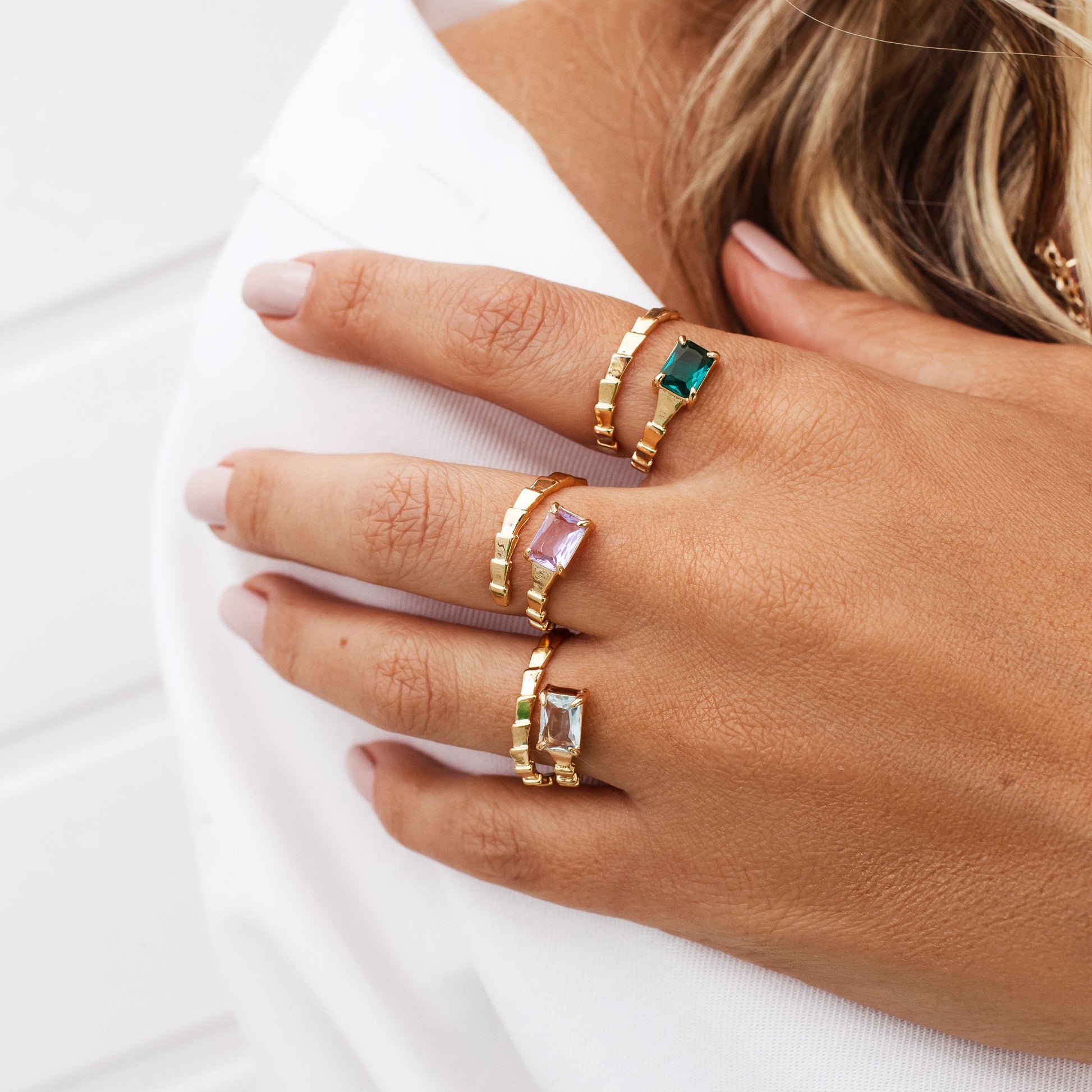Este anel delicado combina design envolvente com escamas lisas, realçado por um retângulo com zircônia na cor aqua que traz cor e sofisticação. Banho em ouro 18k garante brilho duradouro e resistência, elevando seu estilo com elegância e modernidade. Perfeito para destacar sua personalidade com um toque exclusivo.
