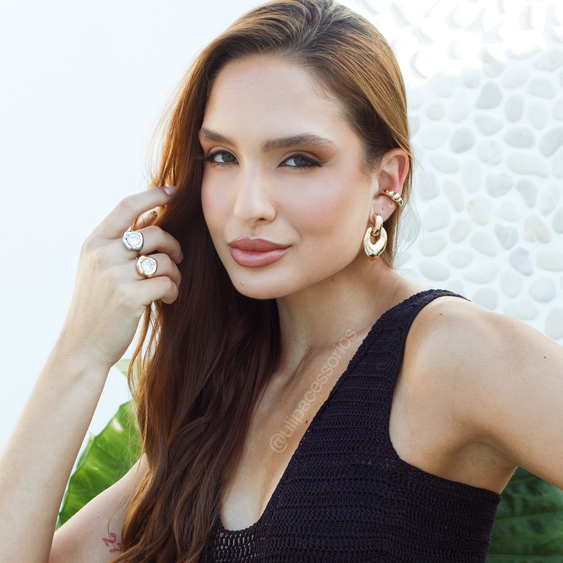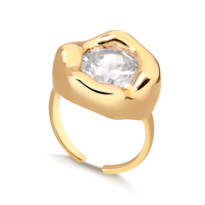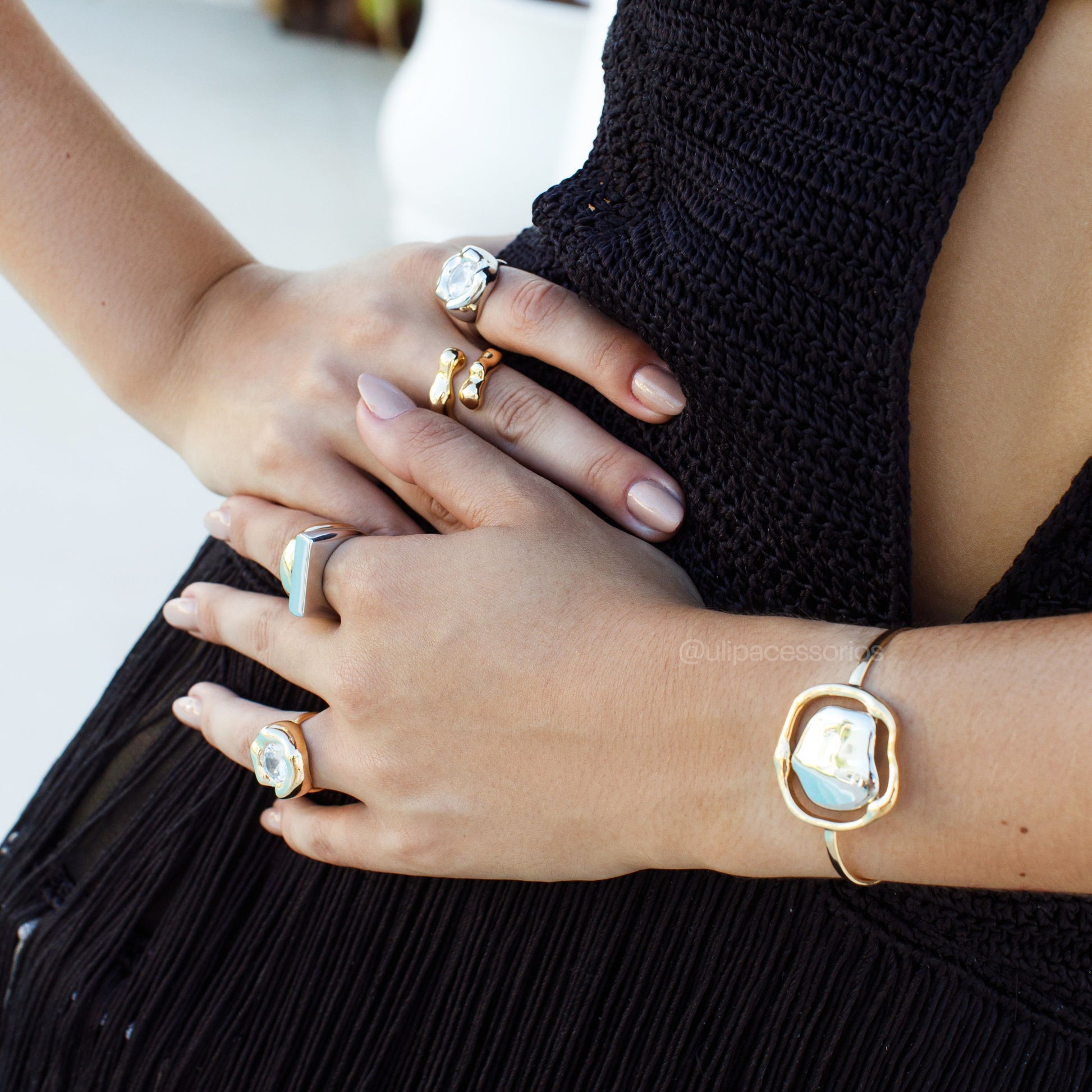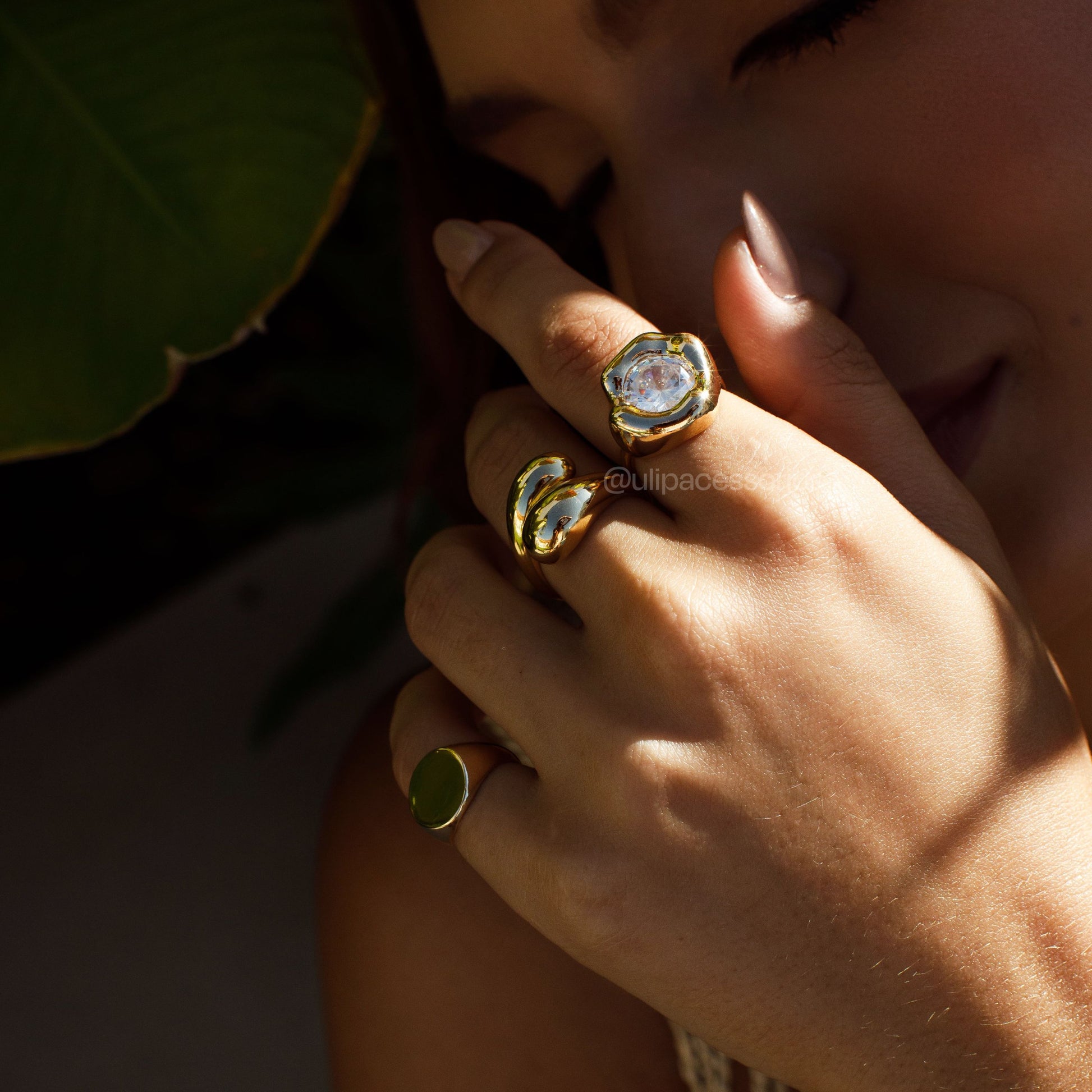 Elegância e sofisticação em um único acessório. Este anel apresenta um cristal orgânico em formato oval, lapidado para capturar e refletir a luz de forma deslumbrante. O banho de ouro 18k confere um acabamento luxuoso e duradouro, garantindo brilho e resistência ao longo do tempo. Perfeito para quem busca um toque de refinamento no dia a dia ou para ocasiões especiais. Um investimento em estilo que complementa qualquer look com elegância atemporal.