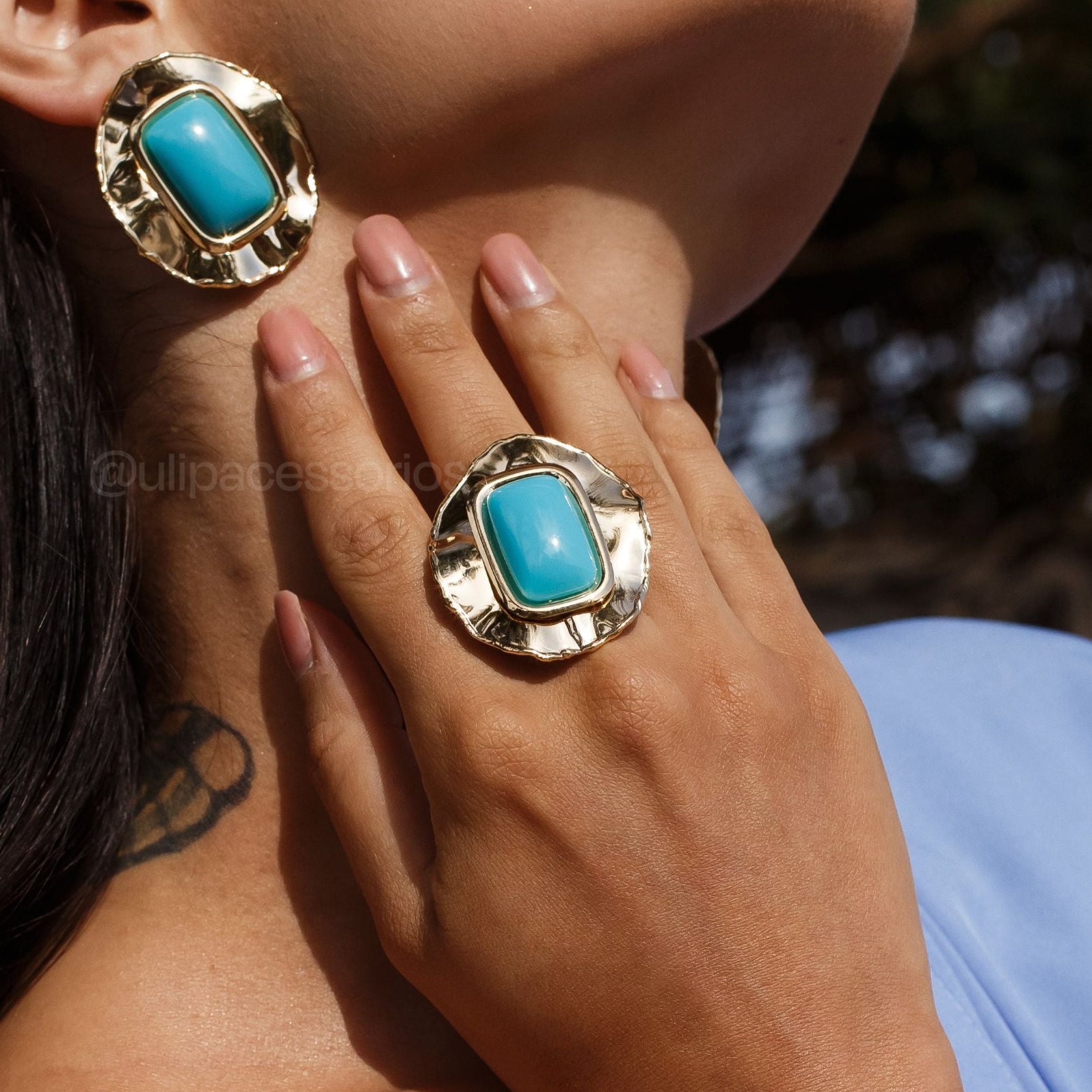 Anel oval orgânico maxi que combina elegância e modernidade. Apresenta um retângulo resinado na cor turquesa em destaque, envolvido por um design fluido e contemporâneo. O banho de ouro 18k confere brilho duradouro e sofisticação ao acessório. Perfeito para quem busca uma peça versátil que transita entre o casual e o sofisticado, elevando qualquer look com estilo e personalidade.