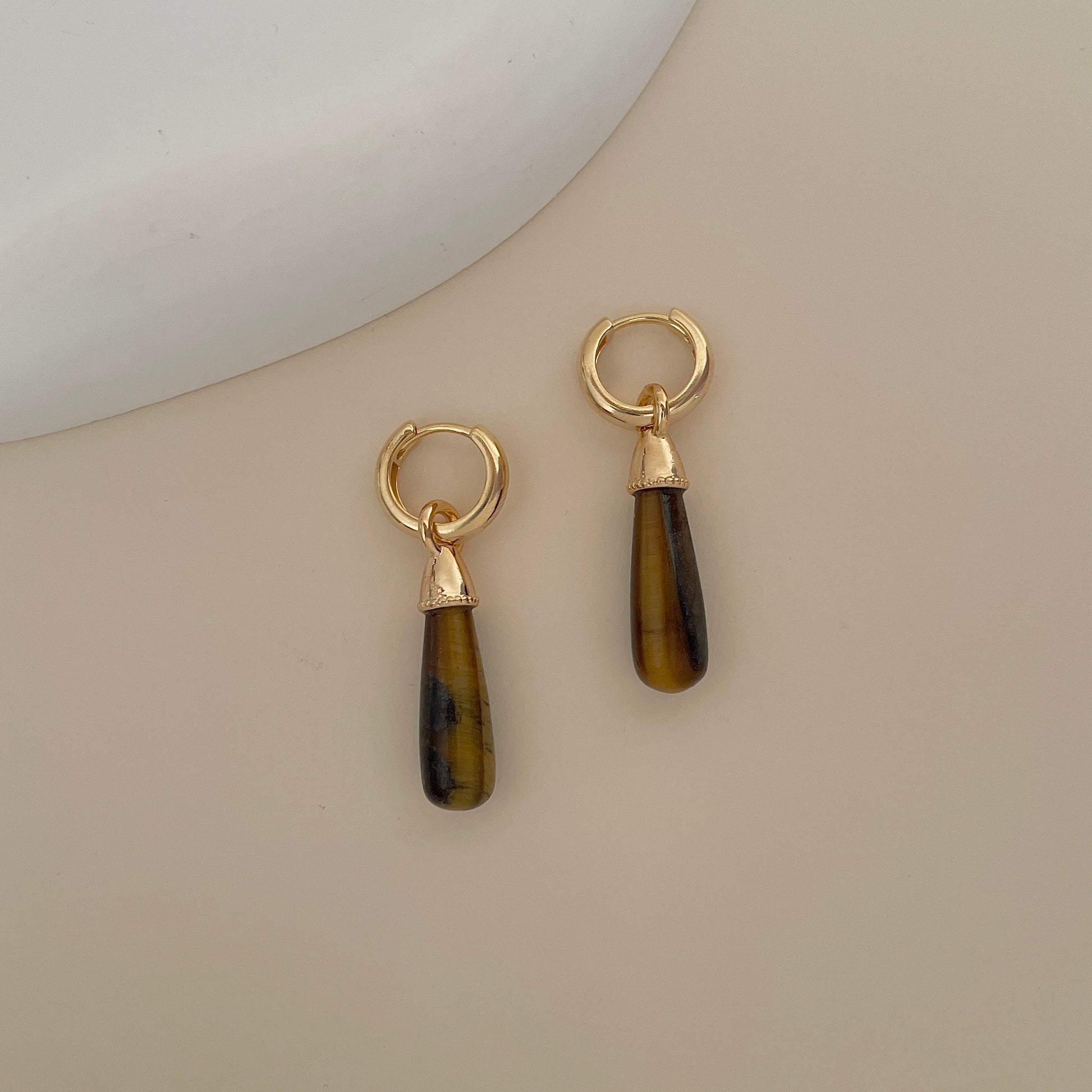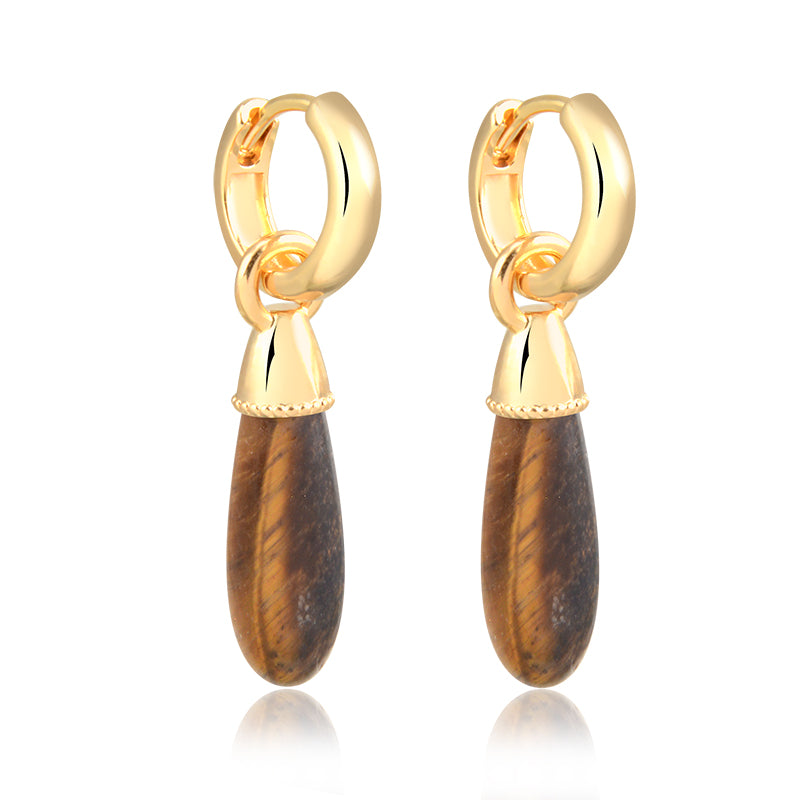 Brinco argola Isla maxi com pingente em pedra natural olho de tigre e banho de ouro 18k