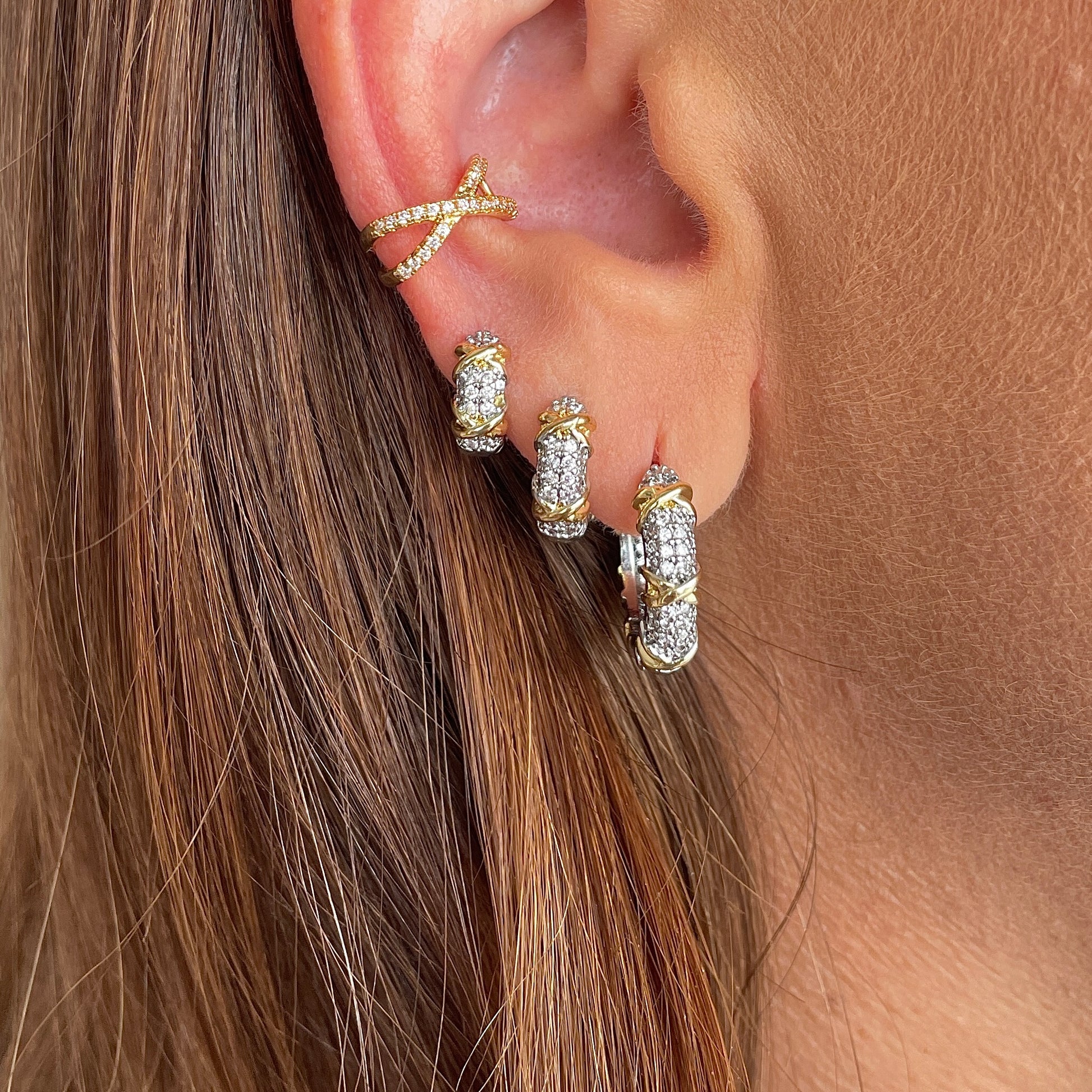 Este brinco argola cravejada combina o brilho sofisticado do banho de ródio branco com o elegante detalhe X dourado, trazendo uma tendência inspirada na alta joalheria para o seu visual. Perfeito para quem busca estilo e exclusividade, ele valoriza qualquer look com um toque moderno e luxuoso. Destaque-se com uma peça que une delicadeza e personalidade.