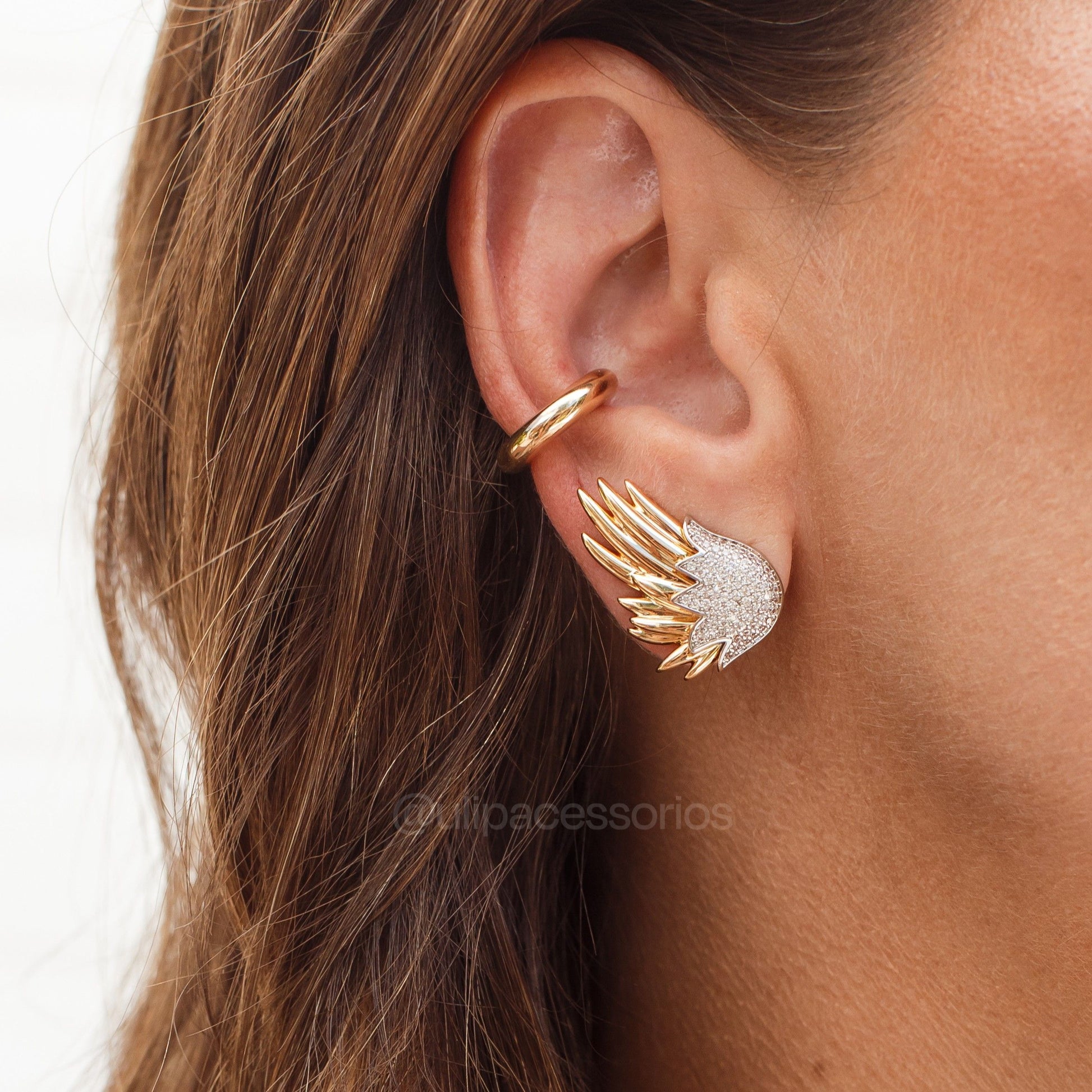 Brinco que une simplicidade e glamour em um único acessório. O design em formato de asa combina superfícies lisas com detalhes cravejados, criando contraste visual interessante e sofisticado. Com banho de ouro 18k, mantém seu brilho e qualidade ao longo do tempo. Inspirado em tendências contemporâneas, é a escolha ideal para quem busca um complemento elegante e versátil. Realce sua beleza natural com este acessório que faz toda a diferença.