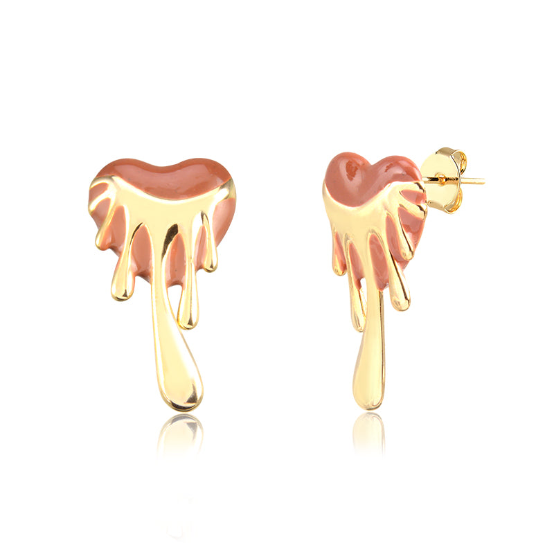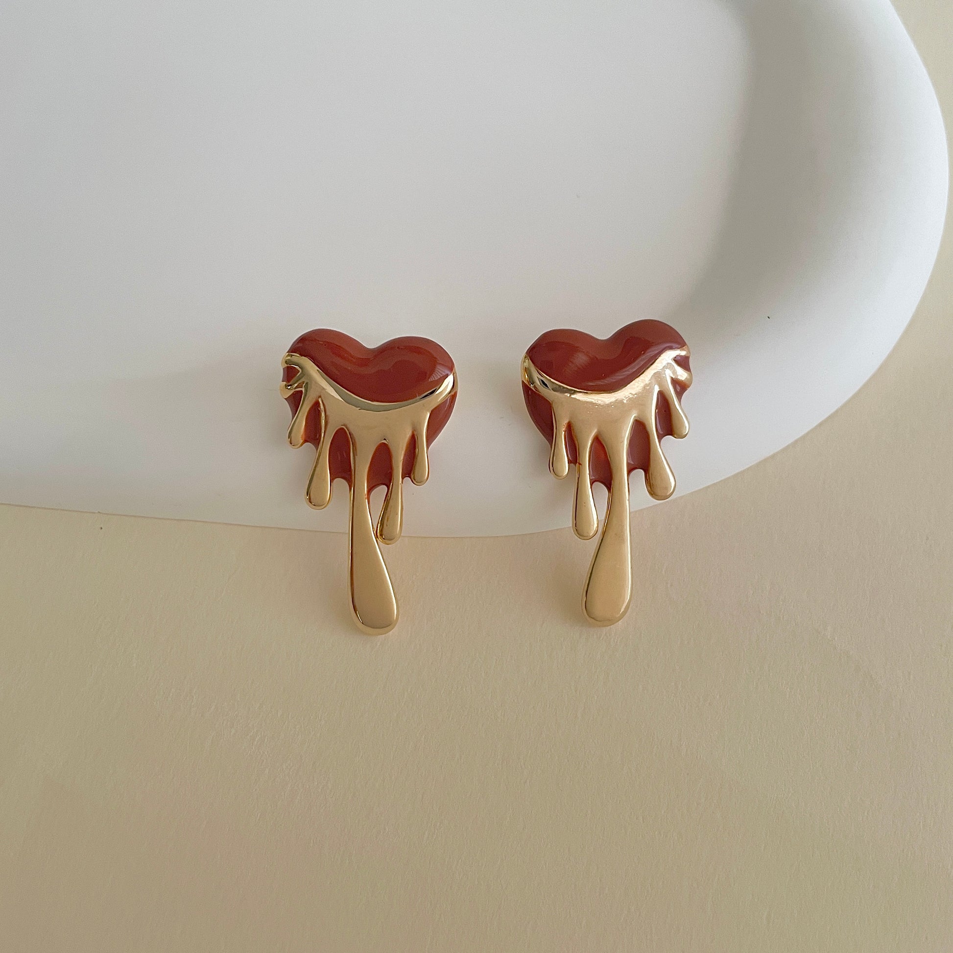 Este brinco em formato de coração derretendo, feito com resina marrom e acabamento em banho de ouro 18k, combina delicadeza e sofisticação. Seu design único valoriza qualquer look, enquanto o banho de ouro garante brilho duradouro e resistência. Um acessório perfeito para quem busca elegância com um toque moderno.