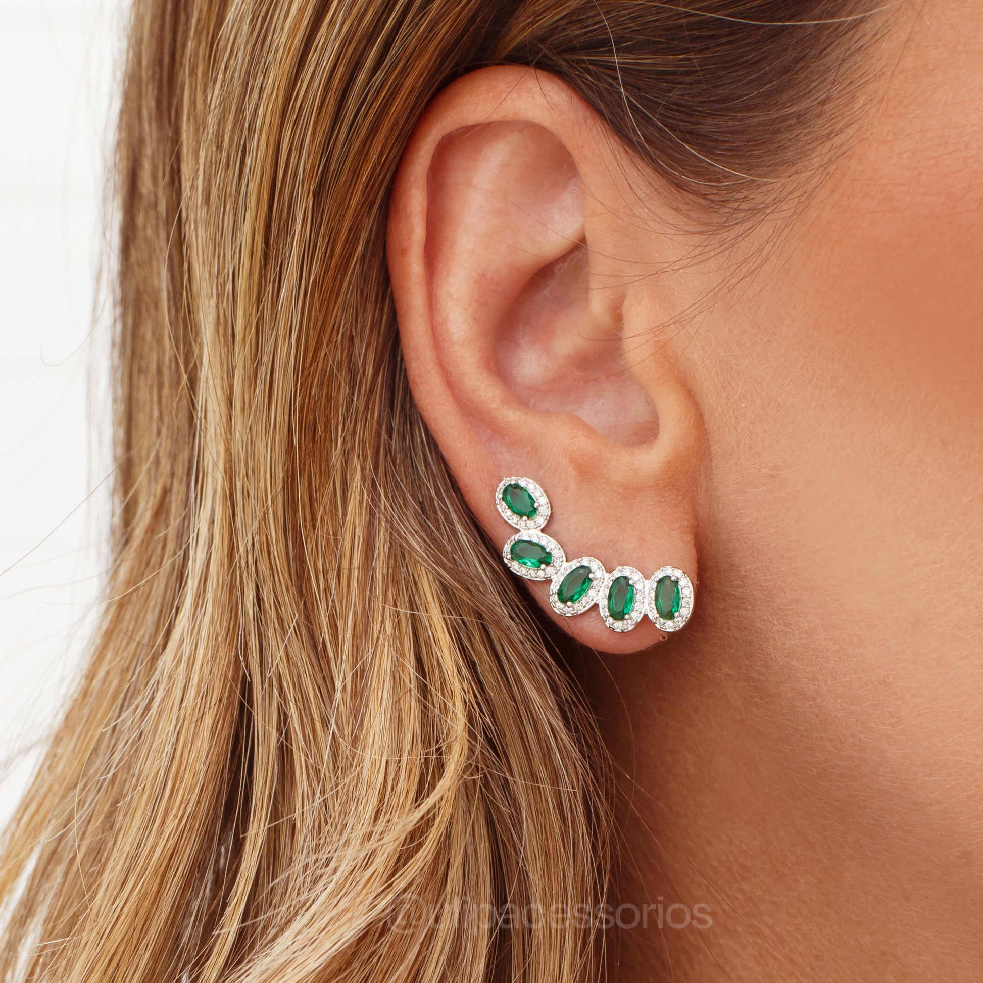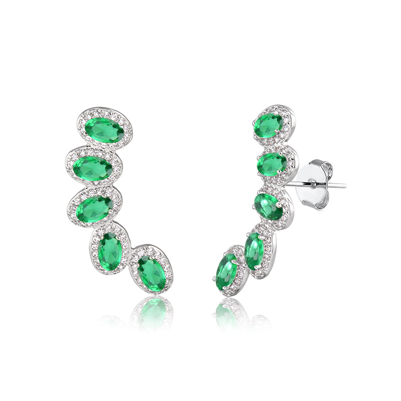 Brinco ear cuff elegante com zircônias em formato oval na cor esmeralda. O banho de ródio branco garante durabilidade e brilho duradouro. Perfeito para complementar looks modernos e sofisticados, trazendo um toque de glamour ao seu visual diário ou para um look de festas