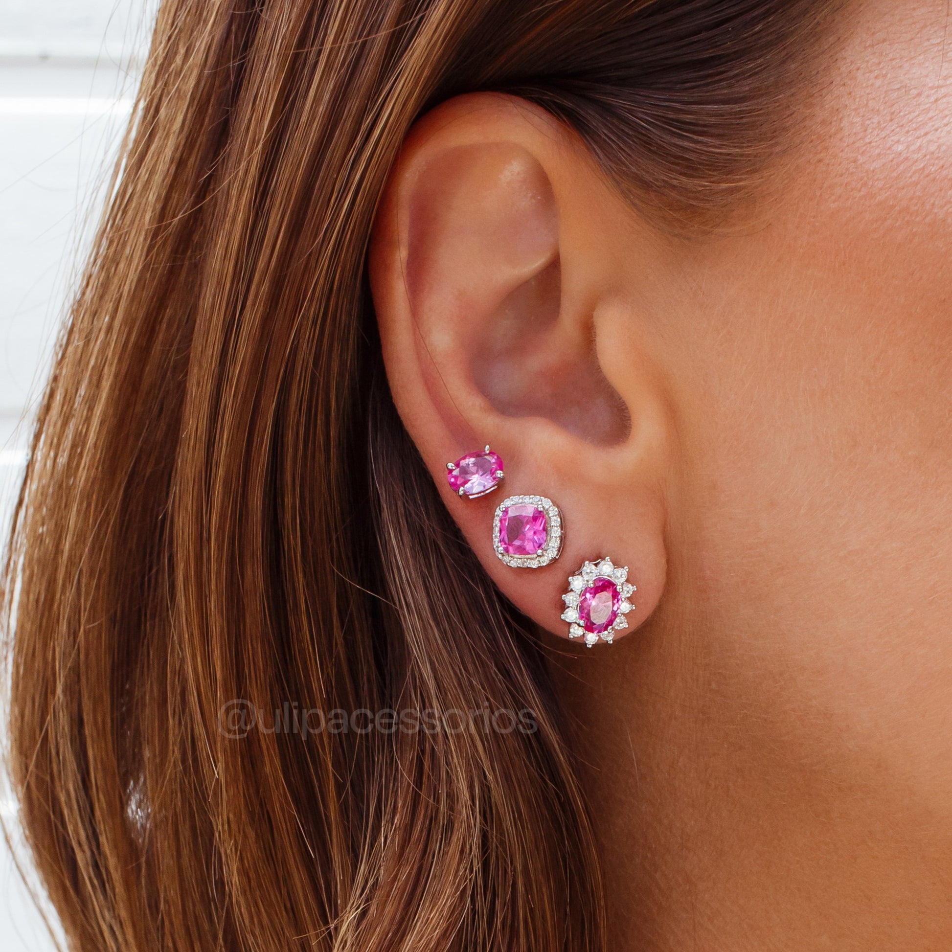 Brinco mini oval turmalina rosa com banho de ródio branco