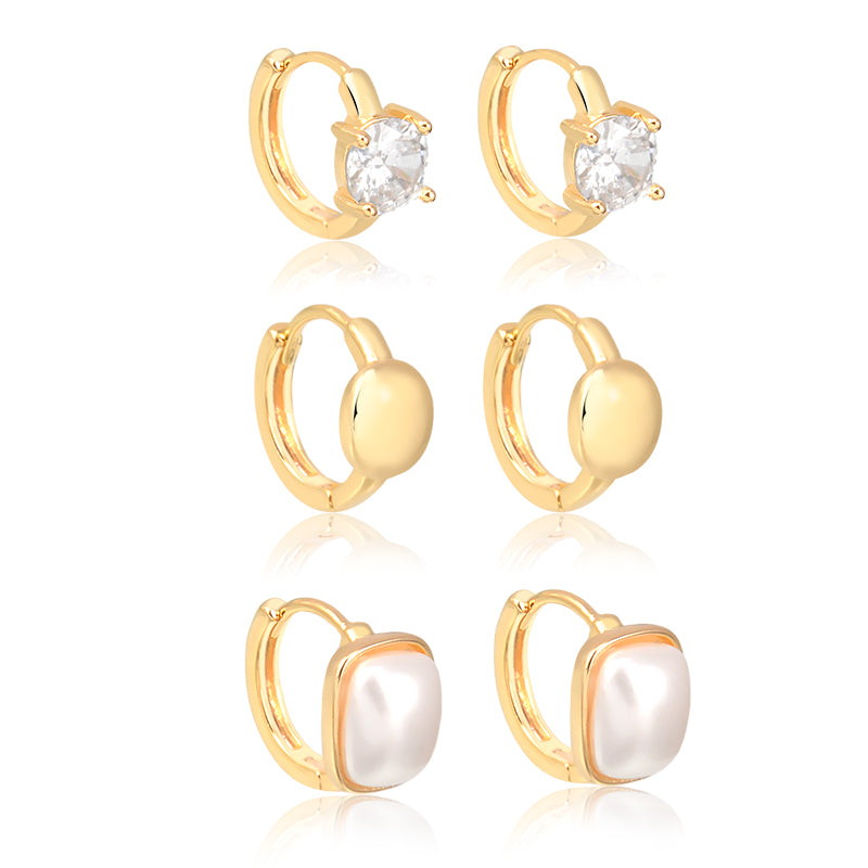 Trio elegante de três argolas em banho de ouro 18k, cada uma com um design único e sofisticado. A primeira apresenta uma pérola branca luminosa, a segunda traz um coração liso e polido, e a terceira é adornada com zircônia cristal que brilha delicadamente. Perfeito para quem busca versatilidade e estilo moderno em um único presente. Use as três juntas para um visual impactante ou combine-as conforme sua preferência. Acabamento brilhante e confortável para uso diário.
