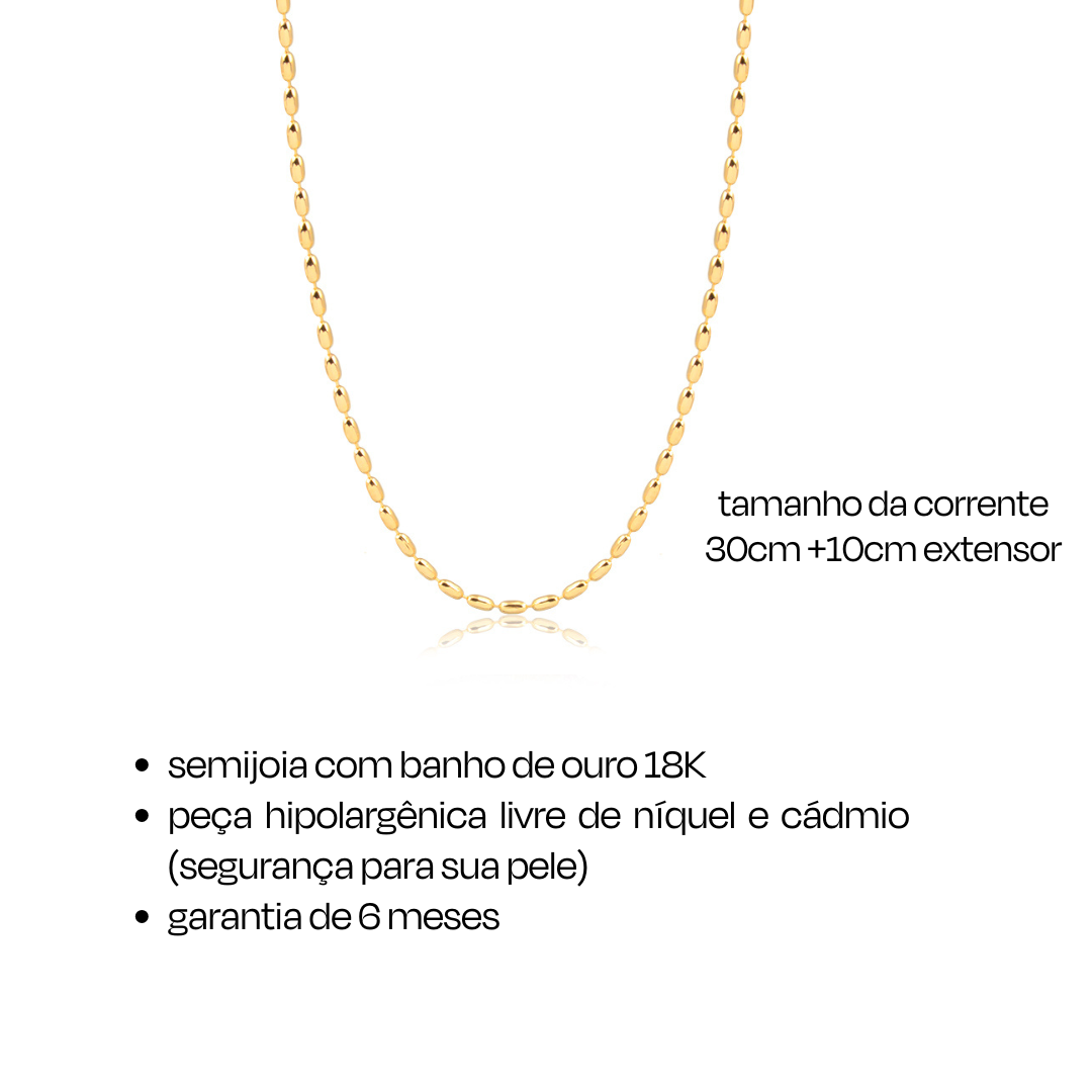 Este colar choker de gominhos com banho de ouro 18k é a escolha perfeita para quem busca elegância e estilo em um acessório versátil. Seu design delicado valoriza qualquer look, enquanto o banho de ouro garante brilho duradouro e resistência. Ideal para ocasiões especiais ou para dar um toque sofisticado ao dia a dia.