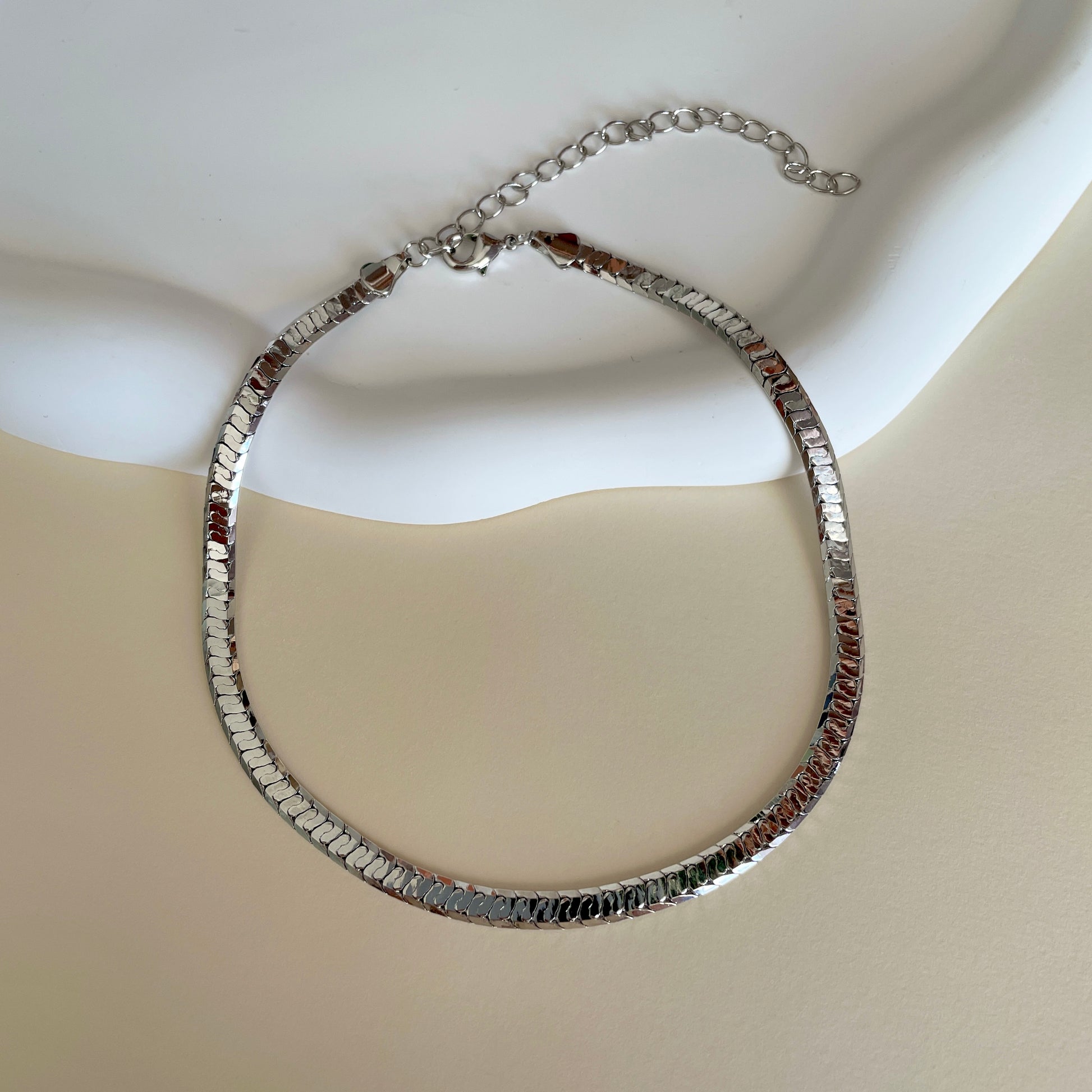 Este colar choker laminado com banho de ródio branco destaca-se pelo seu design sofisticado e 5mm de espessura, garantindo um brilho incomparável que realça qualquer look. Peça ideal para quem busca elegância e durabilidade em um acessório que combina luxo e modernidade.