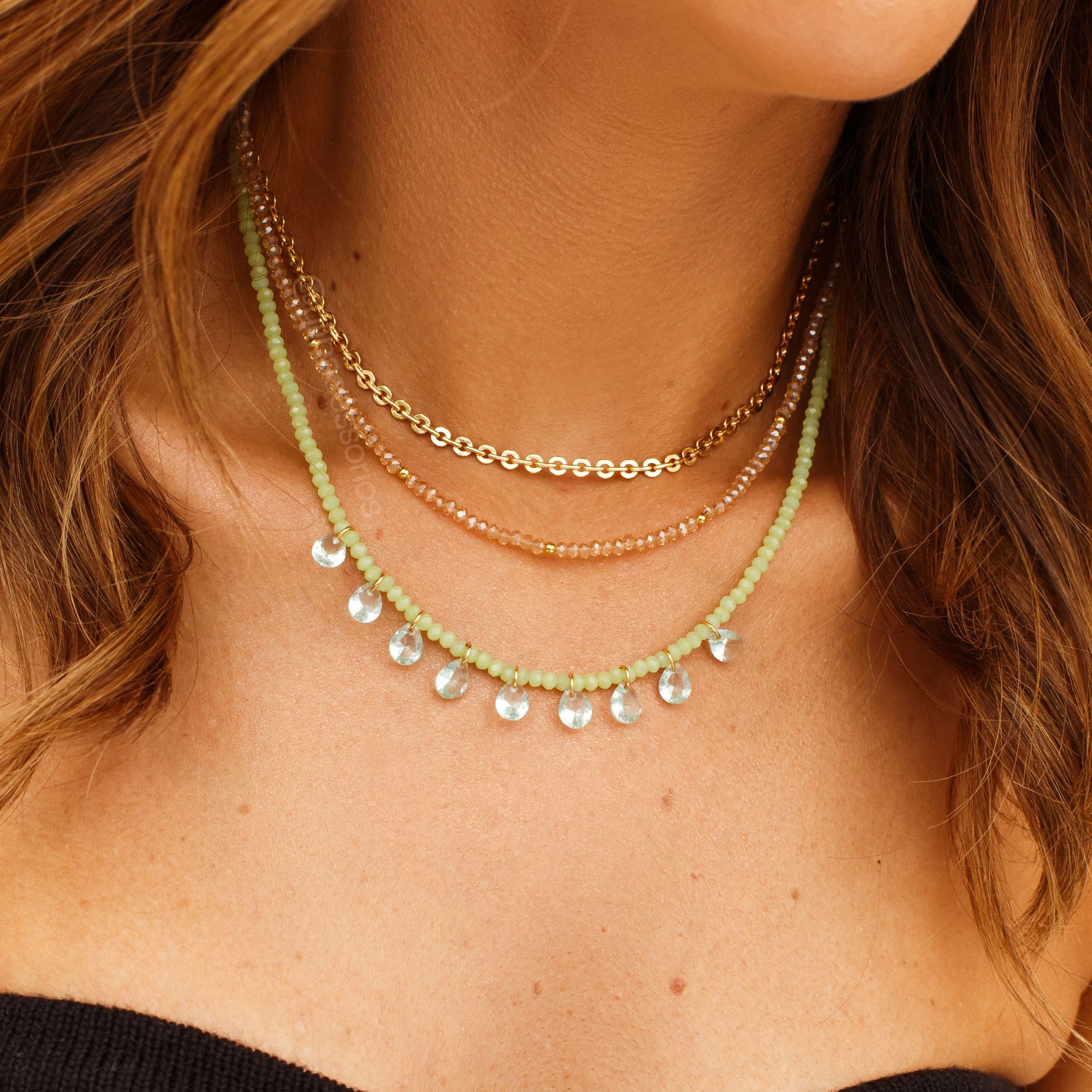 Este colar com cristais champanhe e detalhes dourados, banhado em ouro 18k, oferece um toque de sofisticação e glamour ao seu visual. Seu brilho delicado e acabamento refinado realçam qualquer produção, tornando-o perfeito para momentos especiais e para quem valoriza elegância com estilo.
