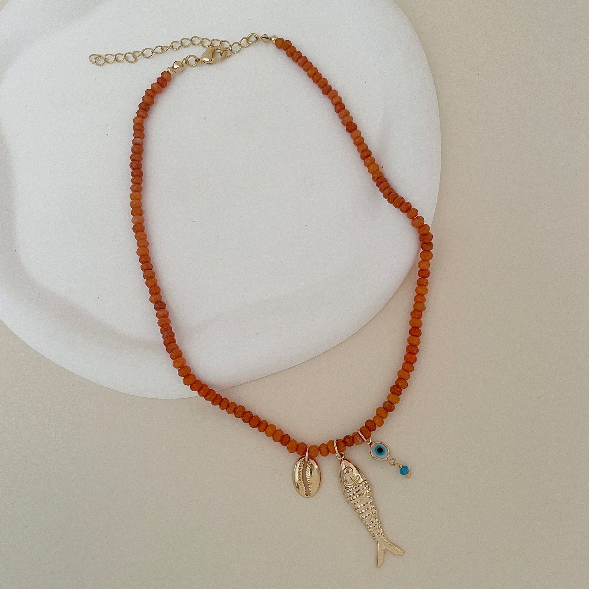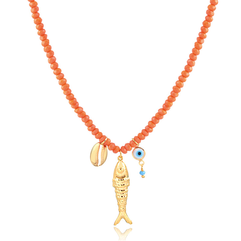 Colar elegante que combina cristais laranja vibrantes com amuletos significativos: peixe, búzio e olho grego. O banho de ouro 18k confere um acabamento sofisticado e duradouro, realçando cada detalhe da peça. Perfeito para quem busca um acessório que une estilo, proteção espiritual e brilho. Use como declaração de moda ou como talismã pessoal que reflete sua personalidade única.