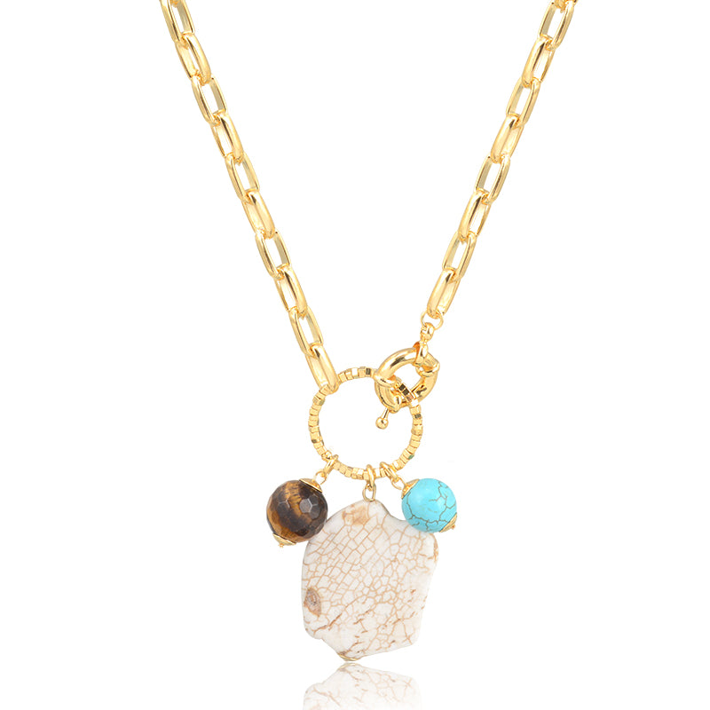 Elegância e energia natural em um único acessório. Este colar de elos apresenta três maxi pedras naturais cuidadosamente selecionadas: howlita para tranquilidade, turquesa para proteção e olho de tigre para força e confiança. O banho de ouro 18k realça a beleza de cada pedra, criando um visual sofisticado e versátil. Perfeito para quem busca combinar estilo com o poder das gemas naturais, este colar é uma declaração de personalidade que funciona tanto no dia a dia quanto em ocasiões especiais.