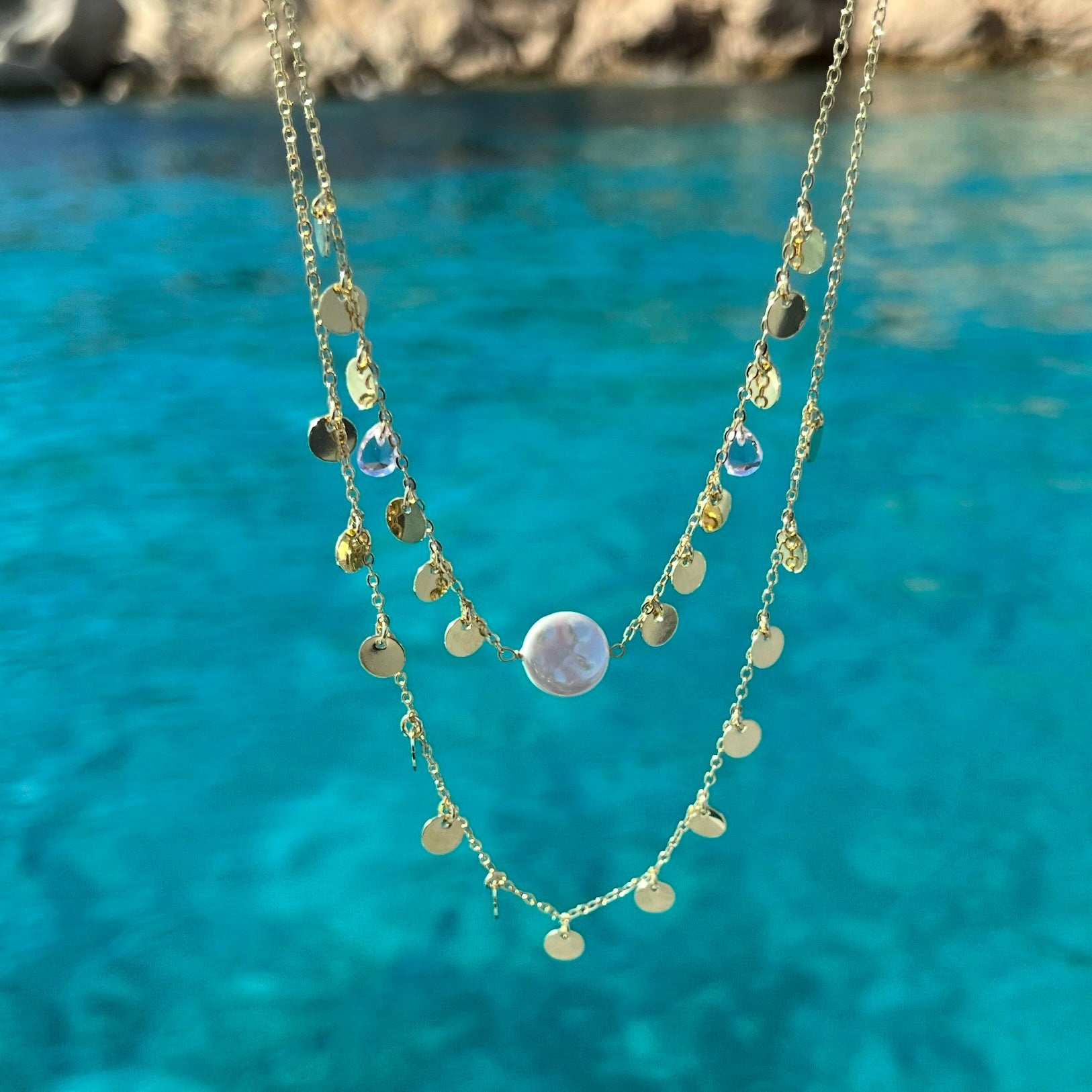 O colar duplo com medalhas, pérola e gota rosa, banhado a ouro 18k, é a combinação perfeita de delicadeza e luxo. Seu design único traz elegância e sofisticação, enquanto o banho de ouro 18k garante brilho duradouro e resistência. Um acessório versátil que valoriza qualquer look, do casual ao sofisticado, realçando seu estilo com charme e personalidade.