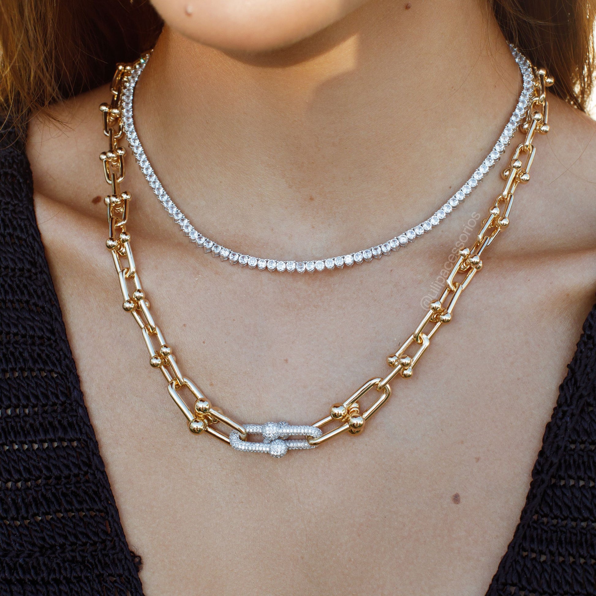 Colar com elos modernos que combina elegância e sofisticação. Cada detalhe é cravejado com precisão, criando um brilho envolvente que acompanha seus movimentos. O banho de ouro 18k garante durabilidade e mantém o acabamento impecável por muito tempo. Perfeito para elevar qualquer look, seja em ocasiões especiais ou no dia a dia. Um acessório versátil que reflete seu estilo refinado e atenção aos detalhes.