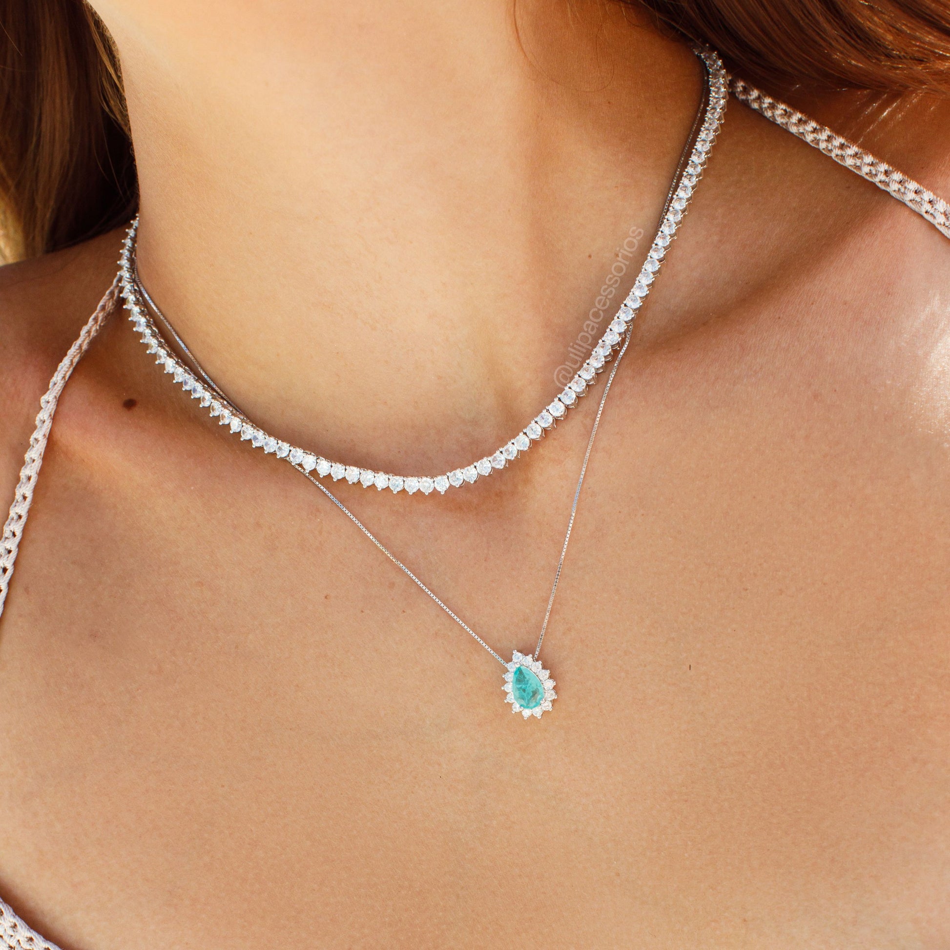 Este colar de esmeralda colombiana é cravejado com zircônia e banho de ródio branco para um brilho deslumbrante. Adicione um toque de elegância e luxo ao seu look com esta peça exuberante e única. Surpreenda-se com a beleza da pedra e o acabamento impecável deste colar!
