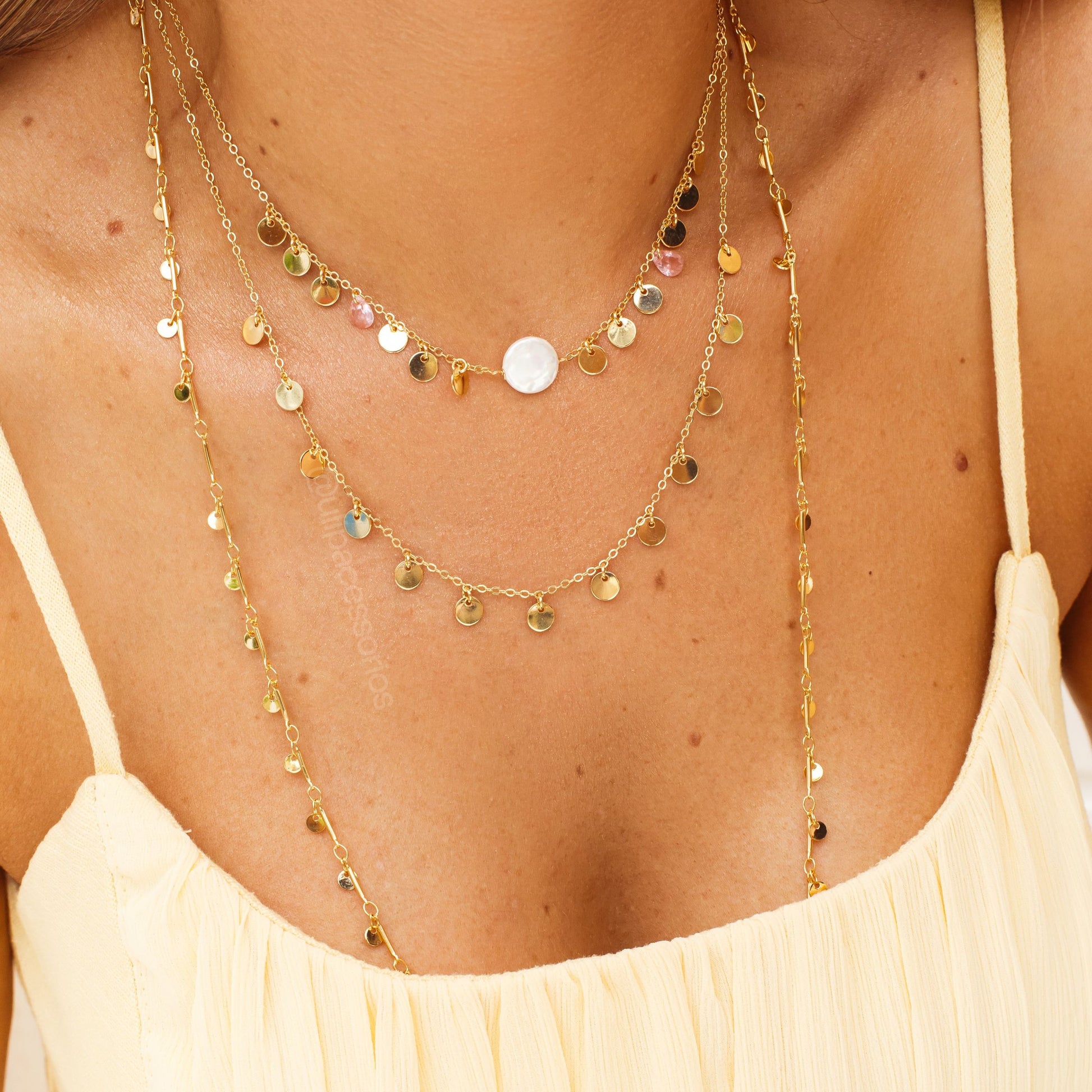 Destaque sua elegância com este colar longo, que combina medalhas delicadas e canutilhos com banho de ouro 18k. Com um brilho sofisticado e acabamento duradouro, essa peça versátil valoriza qualquer look, imprimindo charme e sofisticação em ocasiões casuais ou especiais. Seja o centro das atenções com um acessório que une estilo e qualidade em cada detalhe.