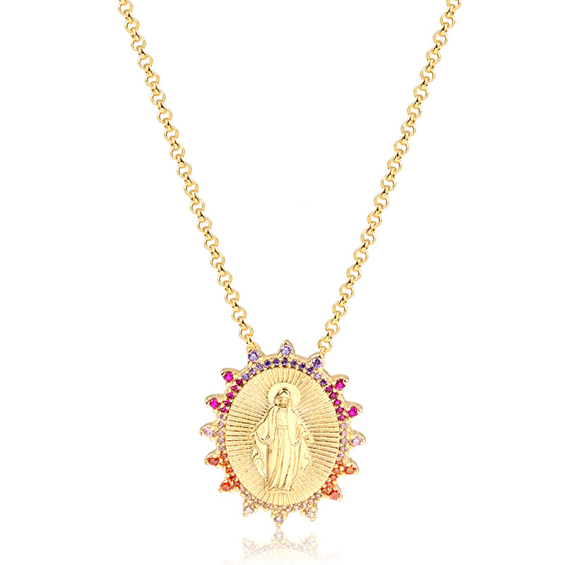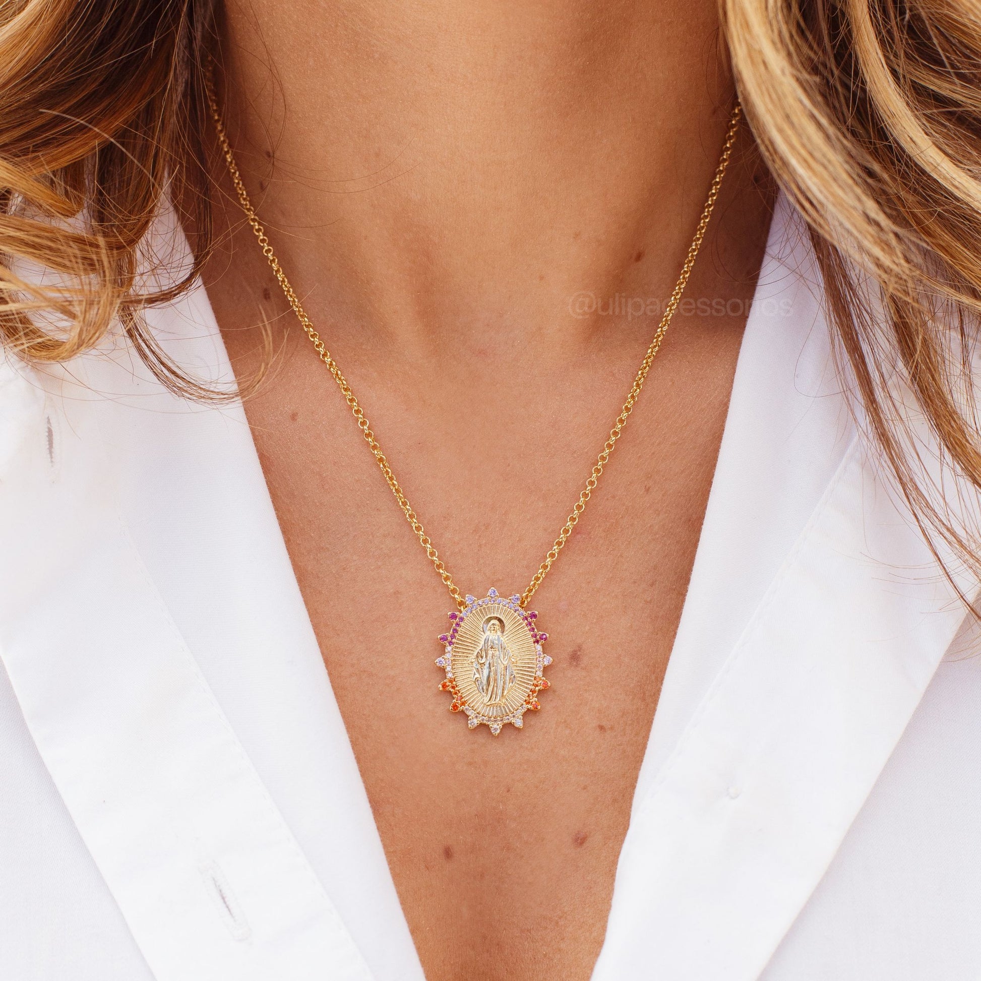 Este colar com medalha de Nossa Senhora, cravejada com zircônias coloridas, combina proteção espiritual e sofisticação. O banho de ouro 18k garante um acabamento brilhante e duradouro, tornando esta peça perfeita para quem deseja expressar fé com elegância e estilo. Um acessório que ilumina seu visual e seu coração.