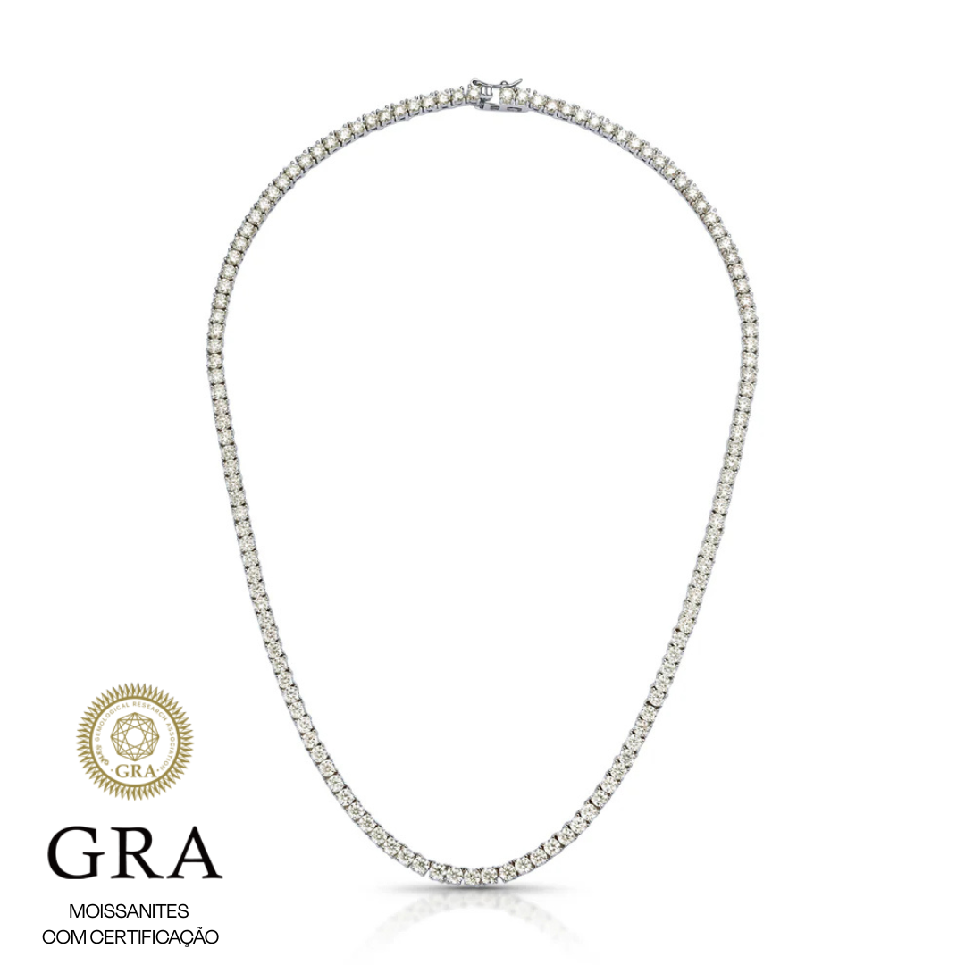 Este colar Riviera de 40cm com trama rígida de 3mm em prata 925 destaca-se pelo brilho intenso da moissanite, que confere sofisticação e elegância. A prata 925 garante resistência e conforto, tornando esta peça perfeita para valorizar seu visual em qualquer ocasião com um toque de luxo discreto e duradouro.