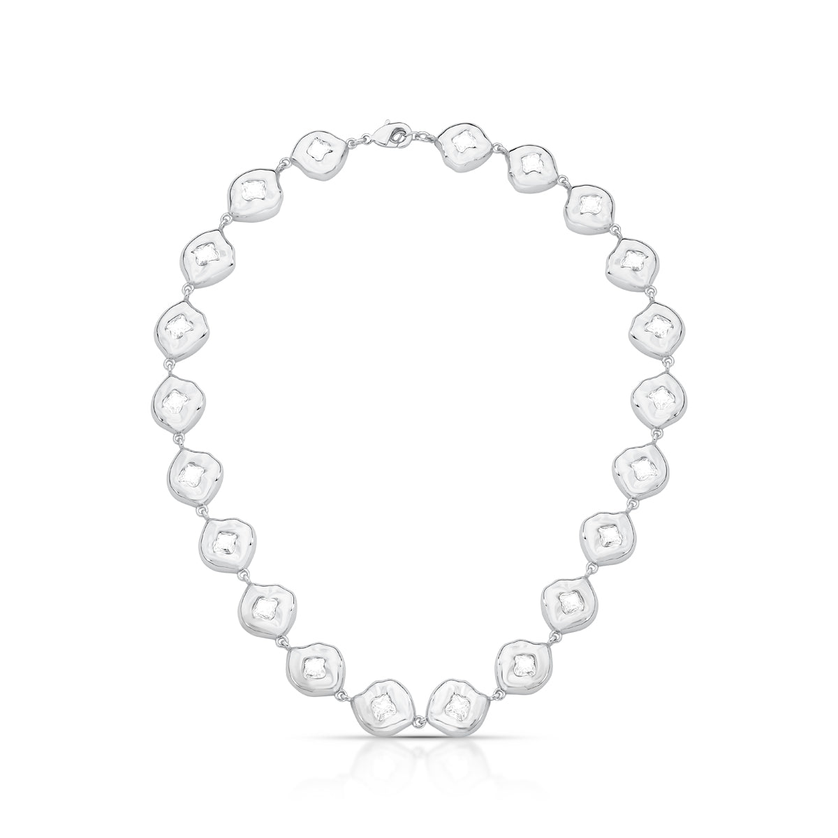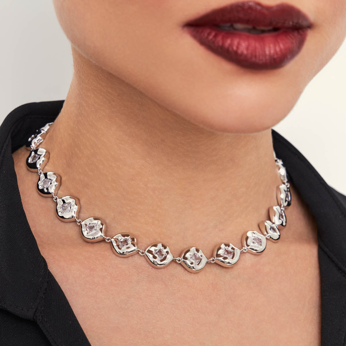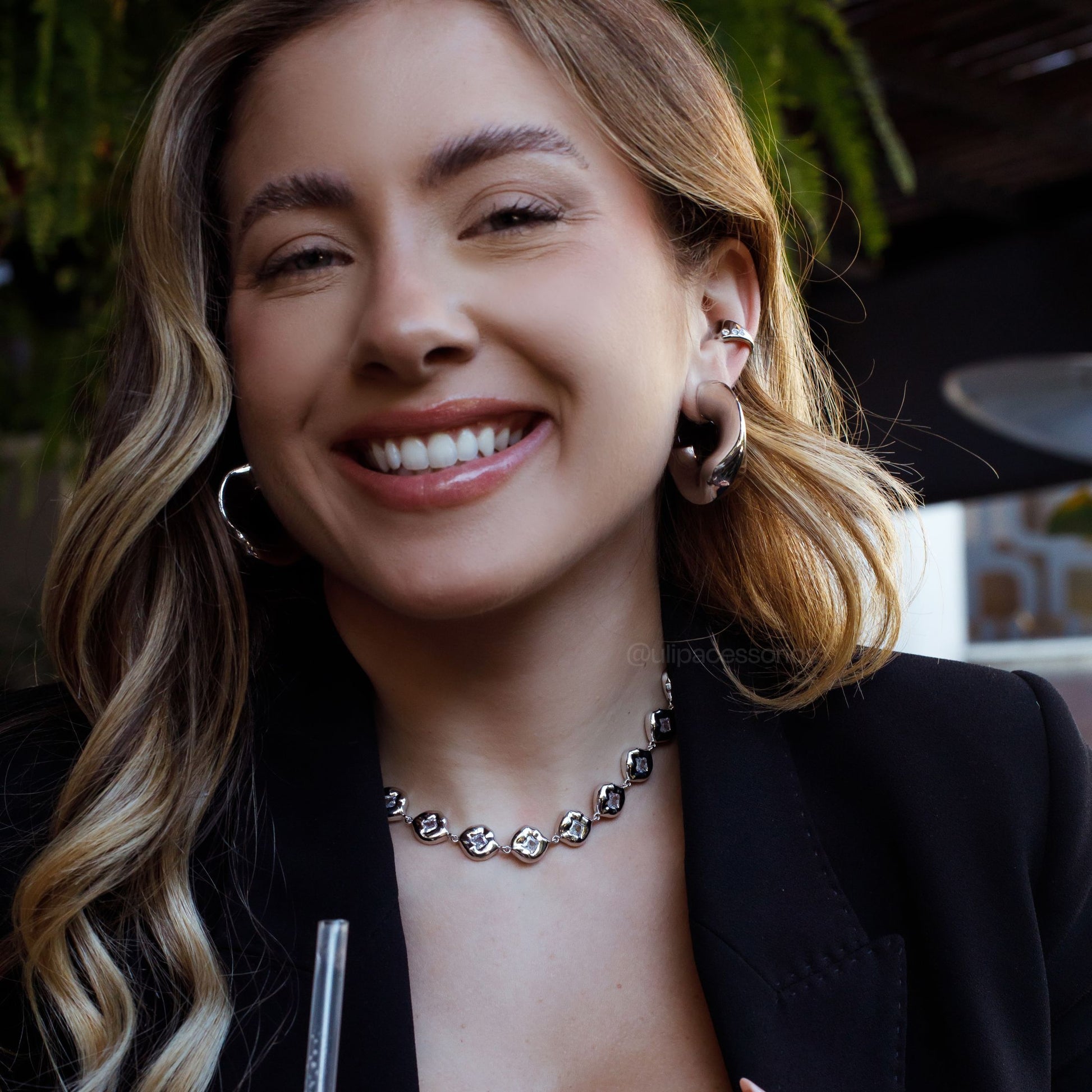 Descubra a elegância do colar com ovais de design orgânico, realçado por zircônias cristalinas que brilham intensamente. Com banho de ródio branco, este acessório une sofisticação e durabilidade, ideal para destacar seu visual com um toque de luxo e delicadeza em qualquer ocasião.