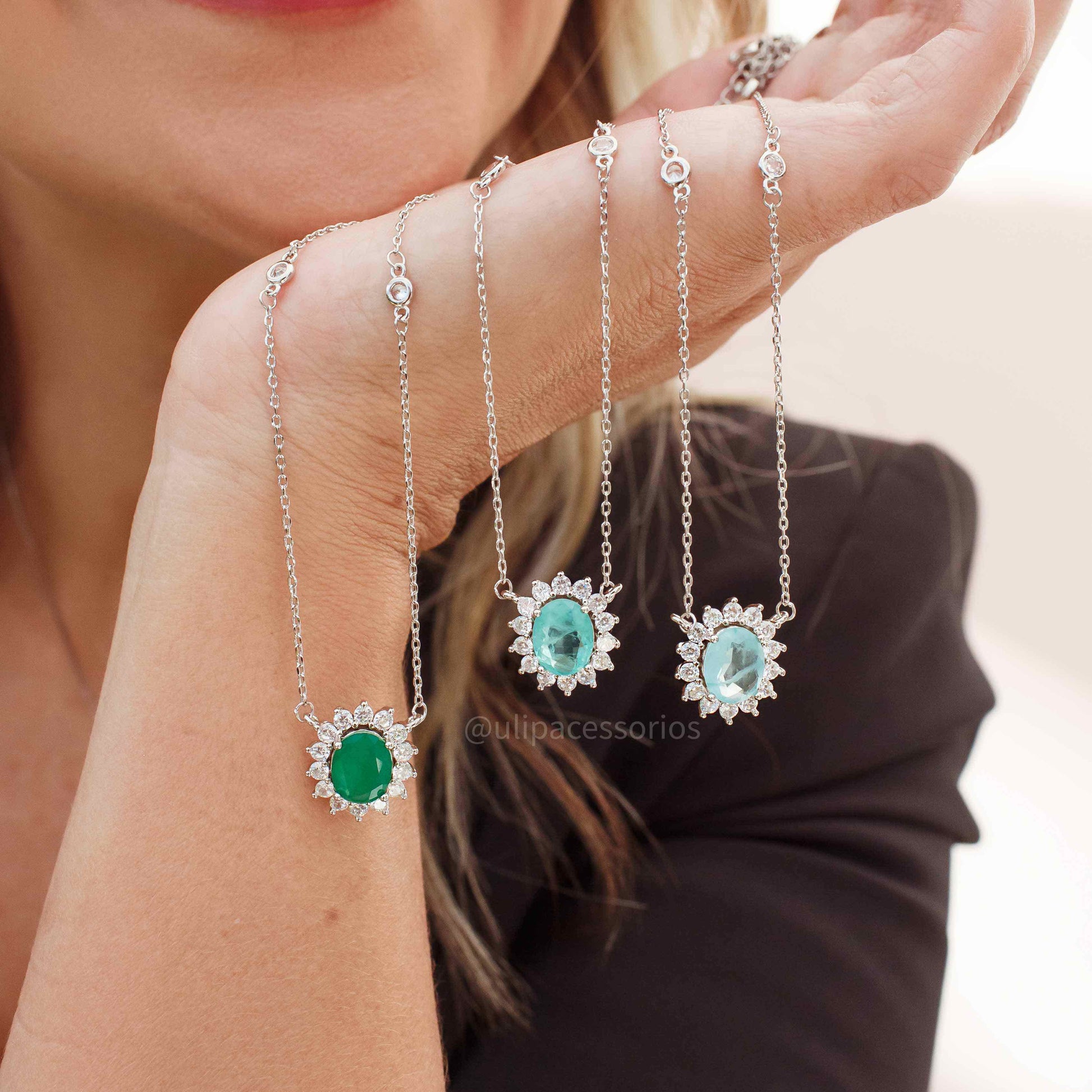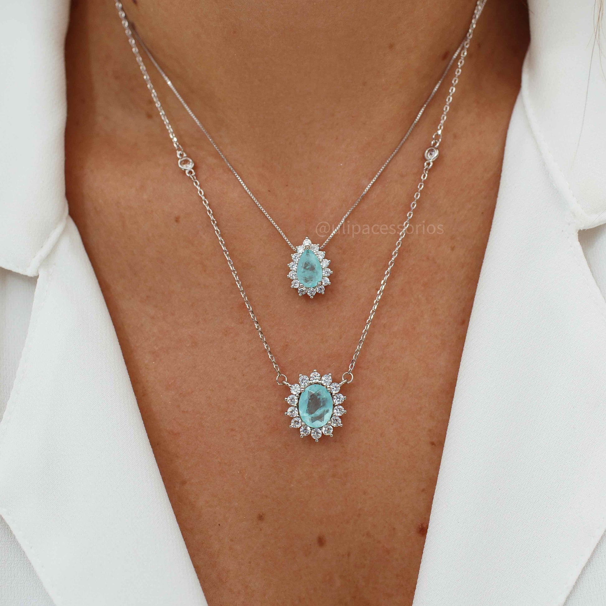 Colar oval em água marinha com design sofisticado e elegante. O entorno é cravejado em cristal, criando um brilho intenso que realça a beleza da pedra central. Finalizado com banho de ródio branco, que garante durabilidade e um acabamento impecável. Perfeito para quem busca um acessório refinado que combina estilo clássico com um toque de modernidade. Ideal para ocasiões especiais ou para elevar seu look do dia a dia.