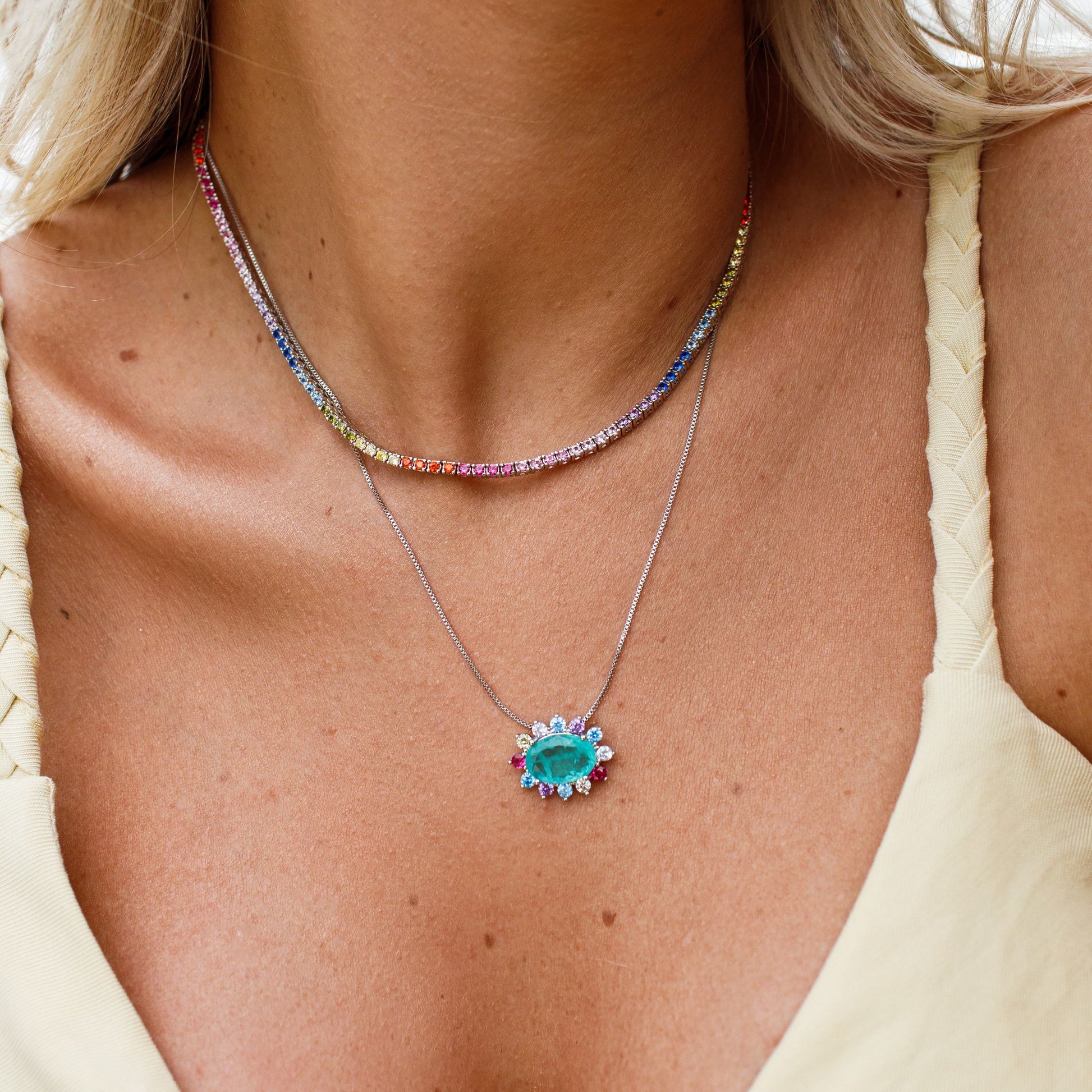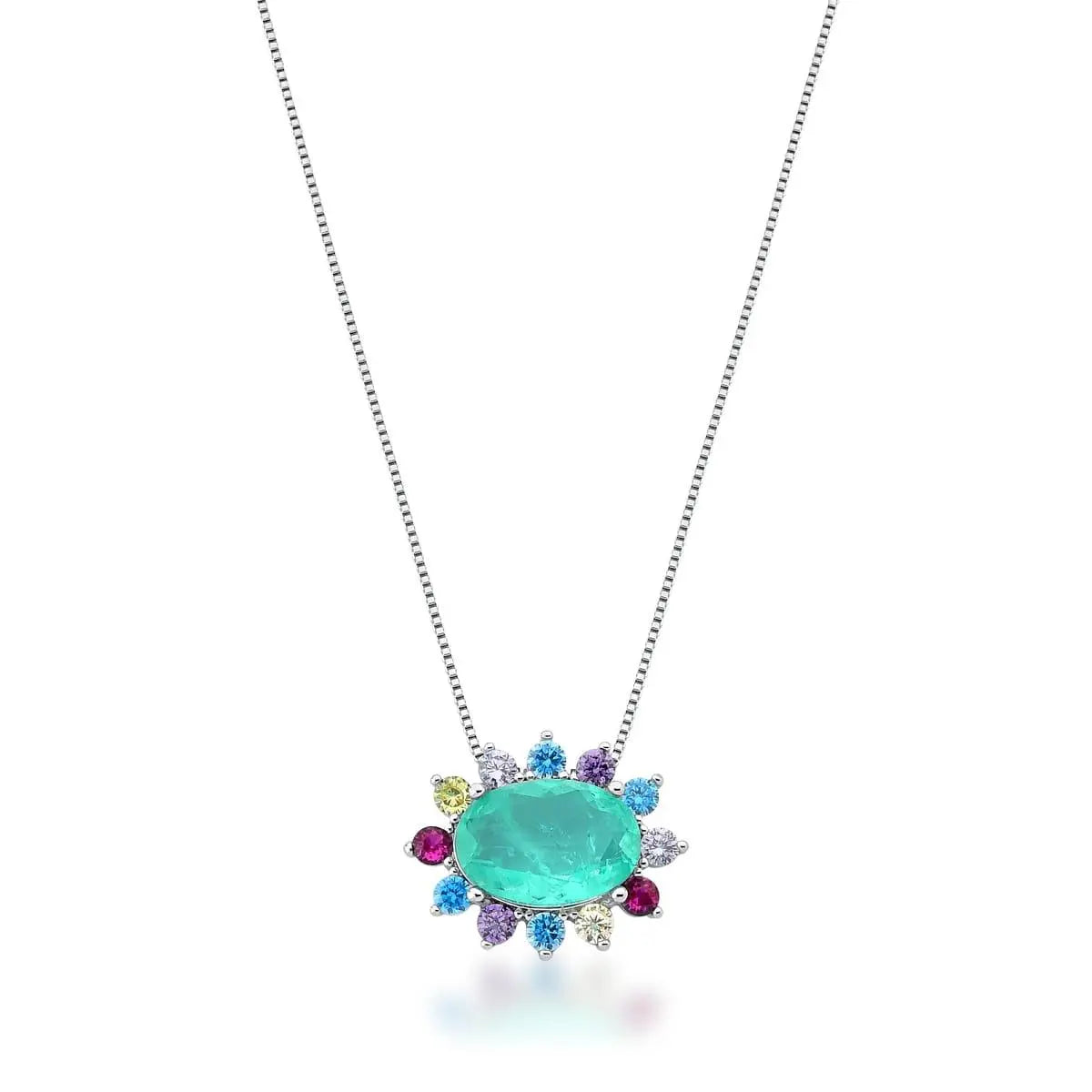 Este colar destaca-se pela delicadeza do oval em esmeralda colombiana, realçado por um entorno colorido que traz vida e sofisticação à peça. O banho de ródio branco confere brilho intenso e proteção contra o desgaste, garantindo durabilidade e elegância para ocasiões especiais. Uma joia que une beleza única e resistência para valorizar seu estilo com exclusividade.
