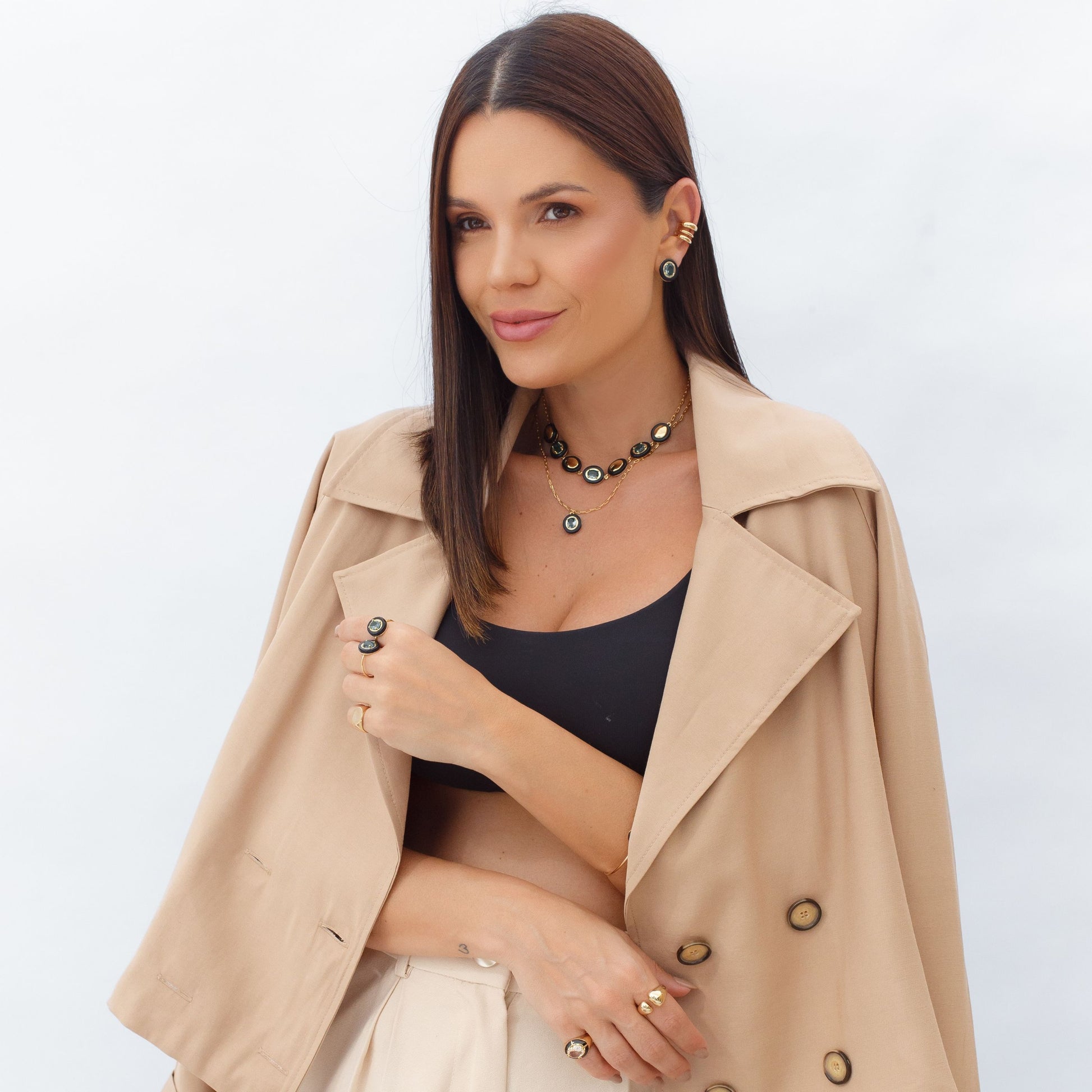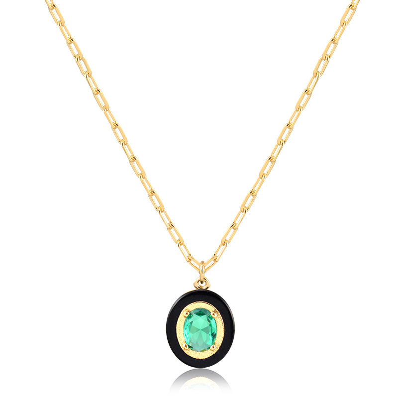 Este colar oval com turmalina e resina preta, banhado a ouro 18k, combina elegância e modernidade. A turmalina destaca-se pela sua beleza única, enquanto o banho de ouro garante durabilidade e brilho sofisticado. Uma peça versátil que valoriza qualquer look, perfeita para quem busca estilo com um toque de exclusividade.