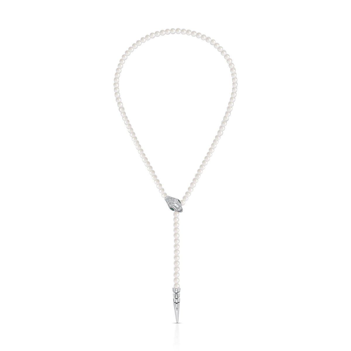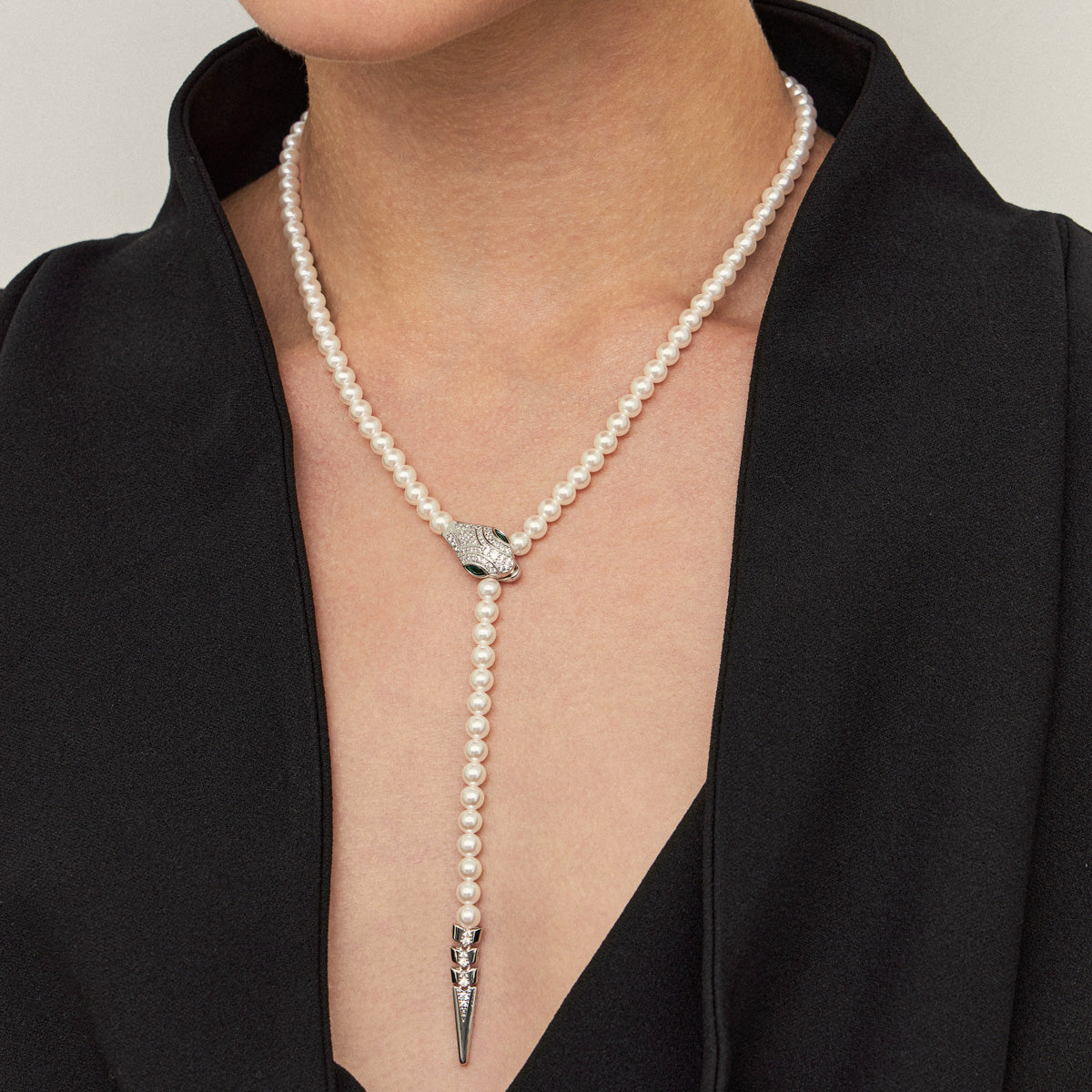 Colar pérolas regulável com pingente snake cravejado e banho de ródio branco
