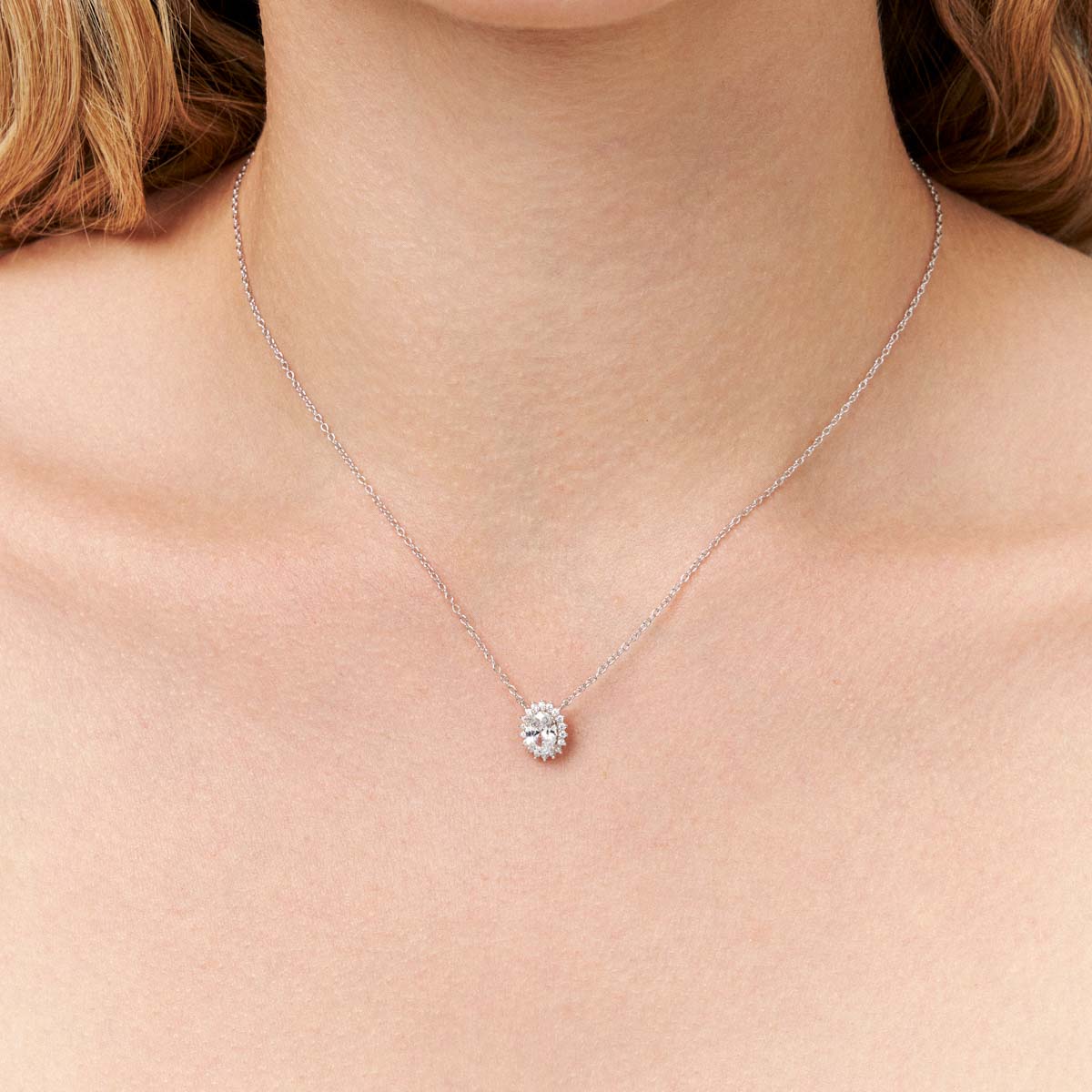 Este colar em prata 925 apresenta um elegante pingente oval com cristal central, realçado por um entorno cravejado que acrescenta brilho e sofisticação. Ideal para realçar qualquer look com um toque de delicadeza e modernidade, é a escolha perfeita para quem busca elegância discreta e durabilidade em um acessório.