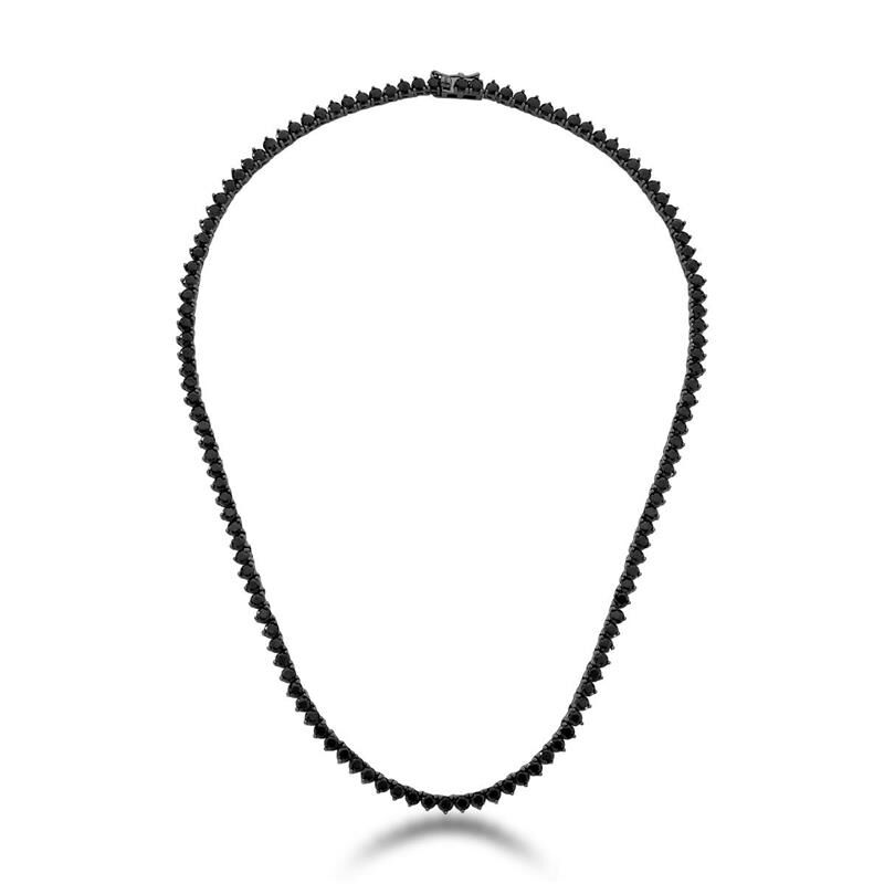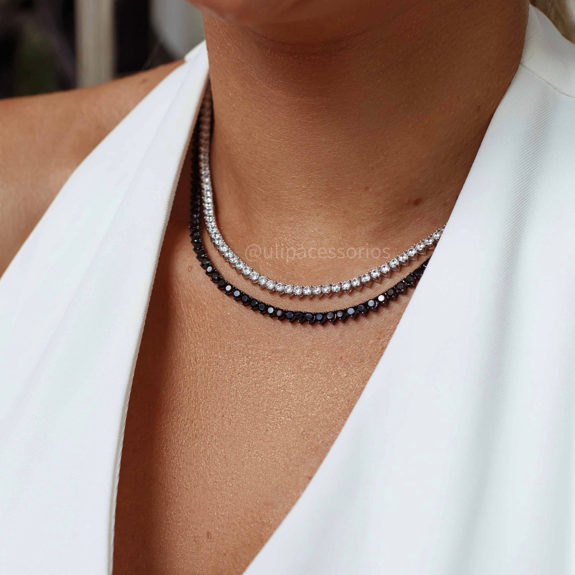 Este colar riviera com 3 garras apresenta uma trama rígida elegante, adornada por zircônias negras de 3mm que conferem sofisticação e brilho discreto. Com banho de ródio negro, oferece durabilidade e um acabamento moderno, perfeito para destacar seu estilo em qualquer ocasião. Seu comprimento de 40cm valoriza o colo com delicadeza e charme. Uma peça versátil que une design contemporâneo e qualidade para realçar sua presença com elegância.