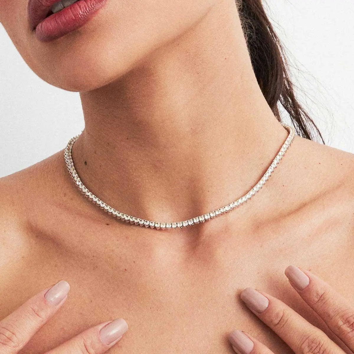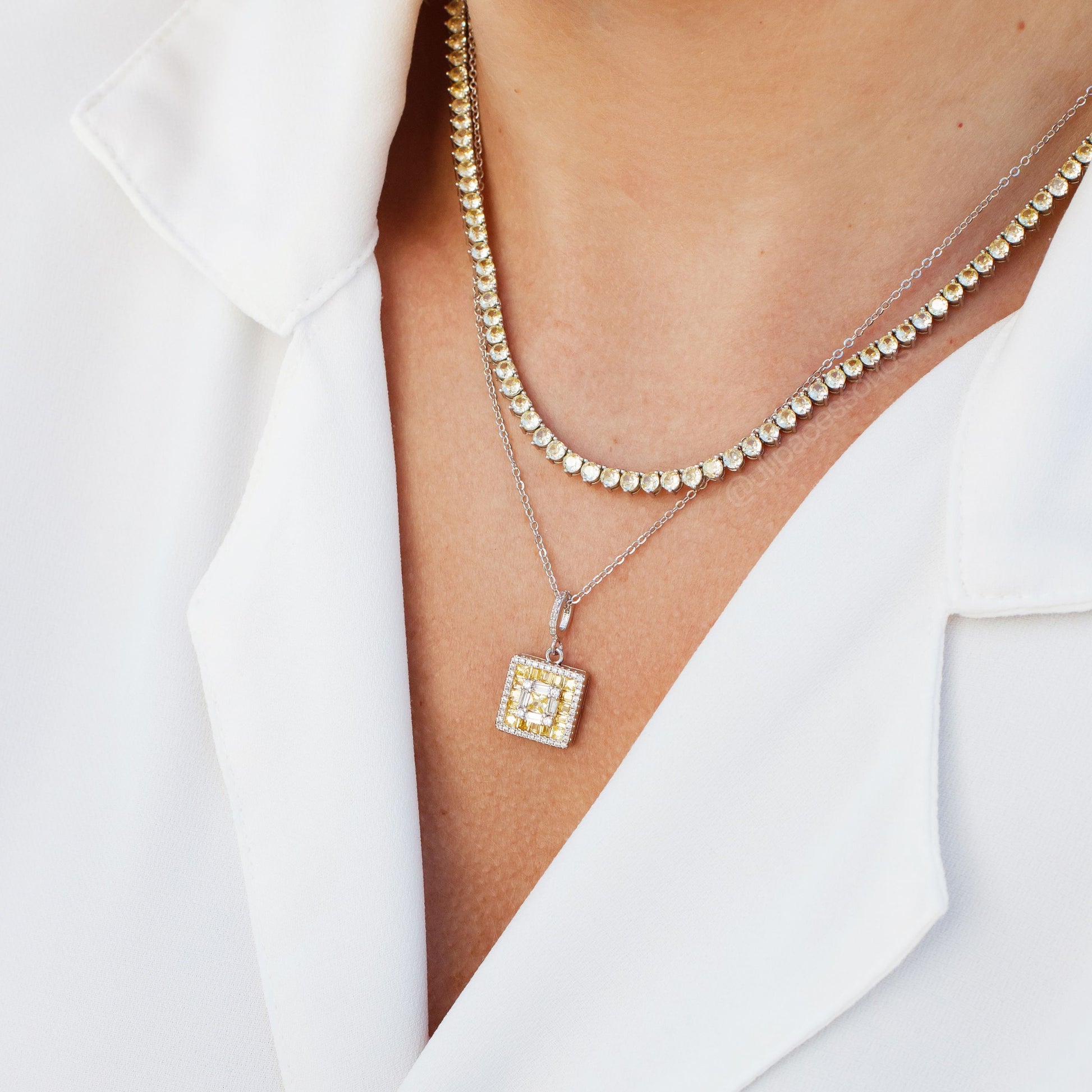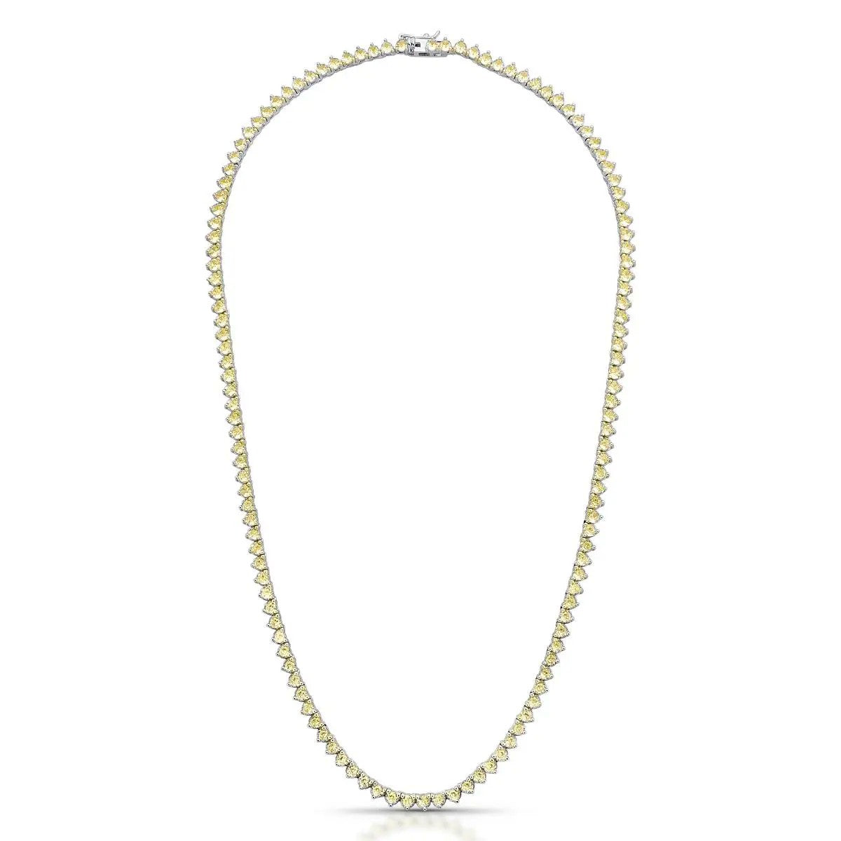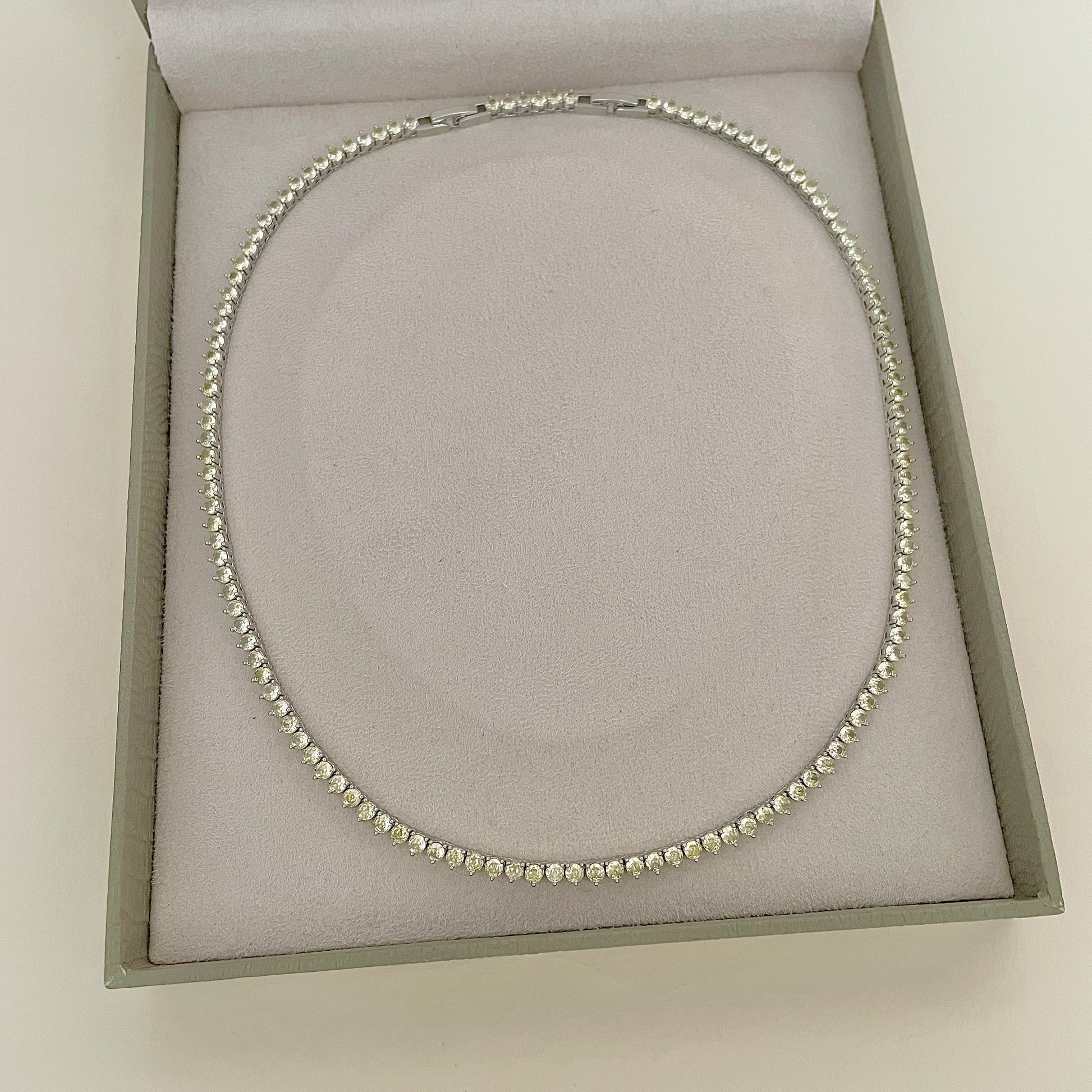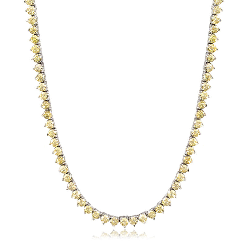 Este colar Riviera com 3 garras apresenta uma trama rígida elegante, zircônias citrino de 3mm que brilham com sofisticação. O banho de ródio branco garante durabilidade e um acabamento impecável, realçando seu visual com um toque moderno e delicado. Perfeito para quem busca um acessório que une beleza e resistência, valorizando qualquer ocasião com charme.