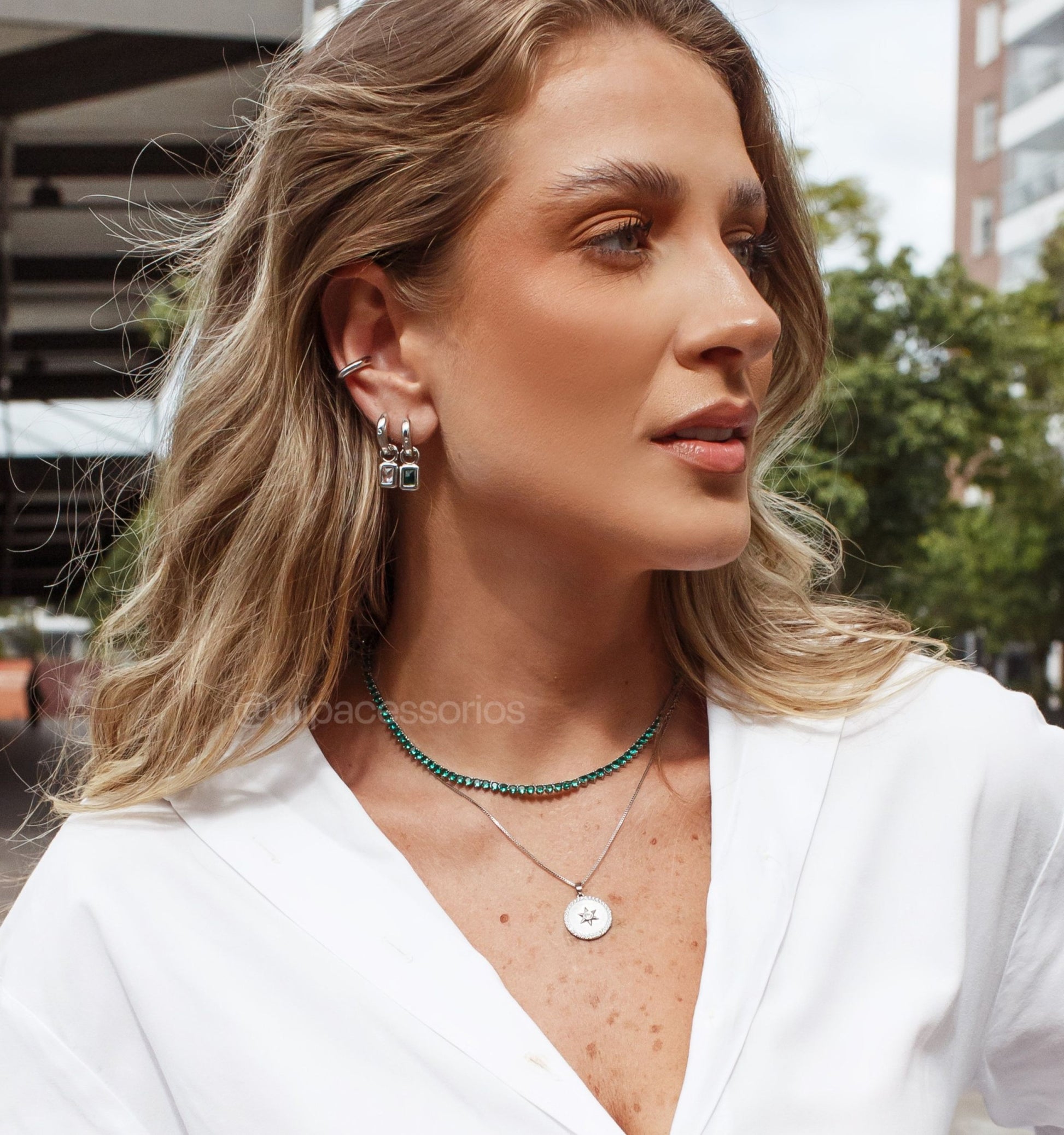 Este colar Riviera com 3 garras apresenta uma trama rígida elegante, zircônias esmeralda de 3mm que brilham com sofisticação. O banho de ródio branco garante durabilidade e um acabamento impecável, realçando seu visual com um toque moderno e delicado. Perfeito para quem busca um acessório que une beleza e resistência, valorizando qualquer ocasião com charme. Possui 40cm de comprimento