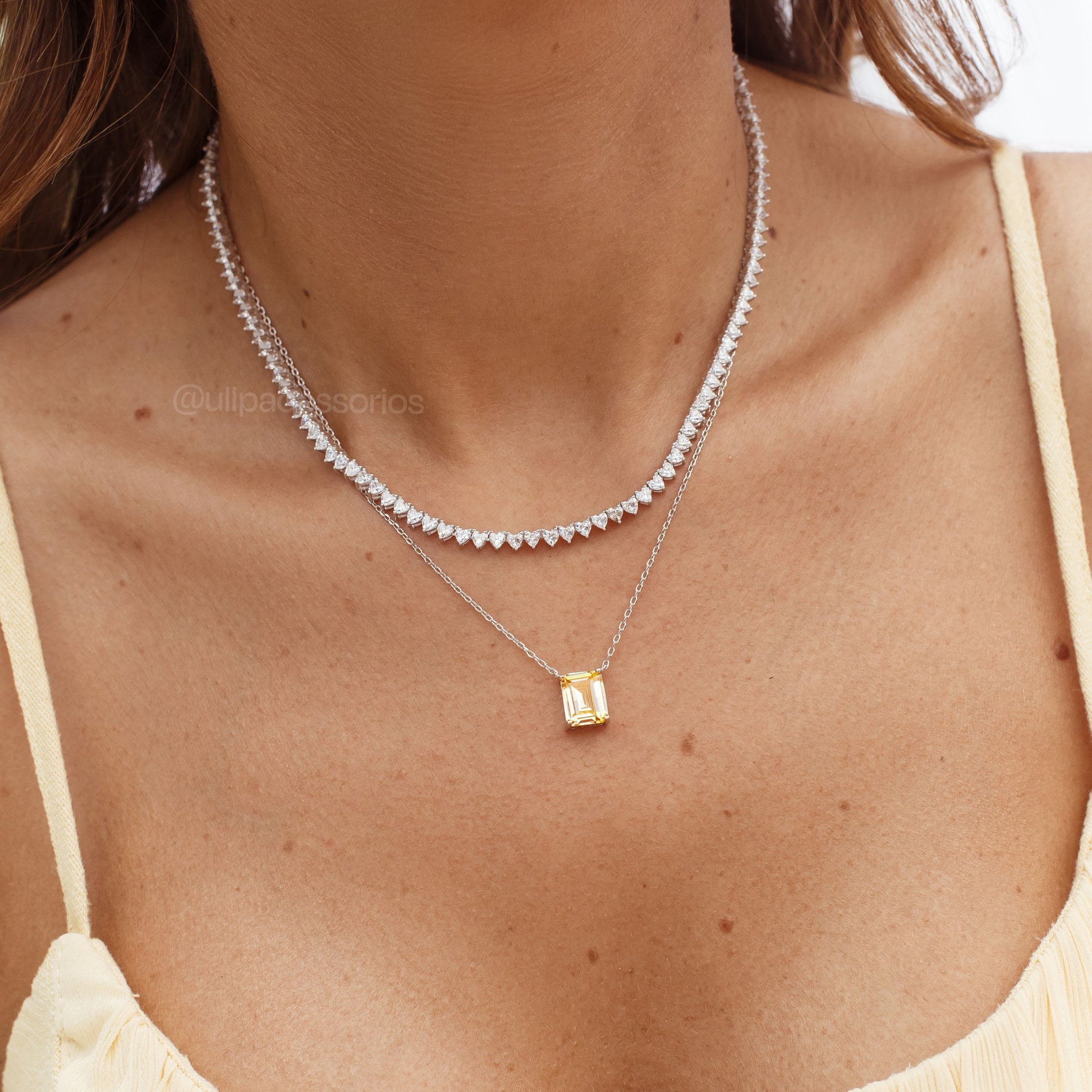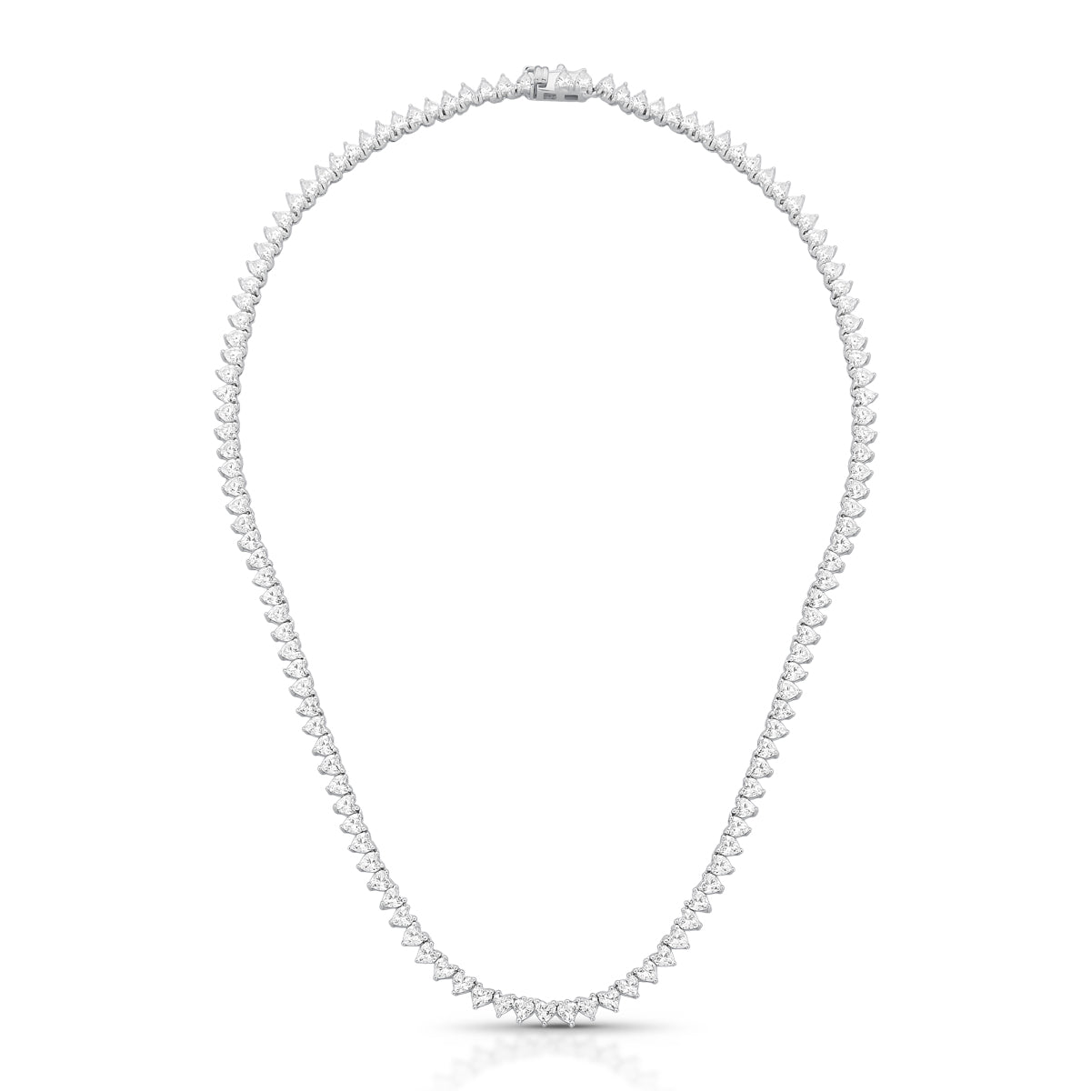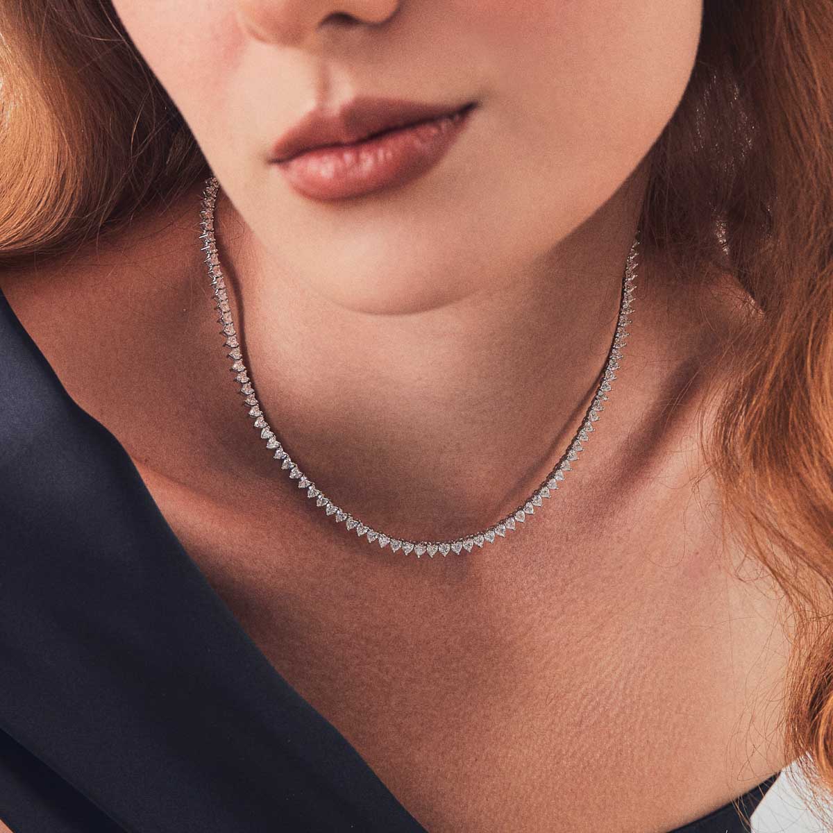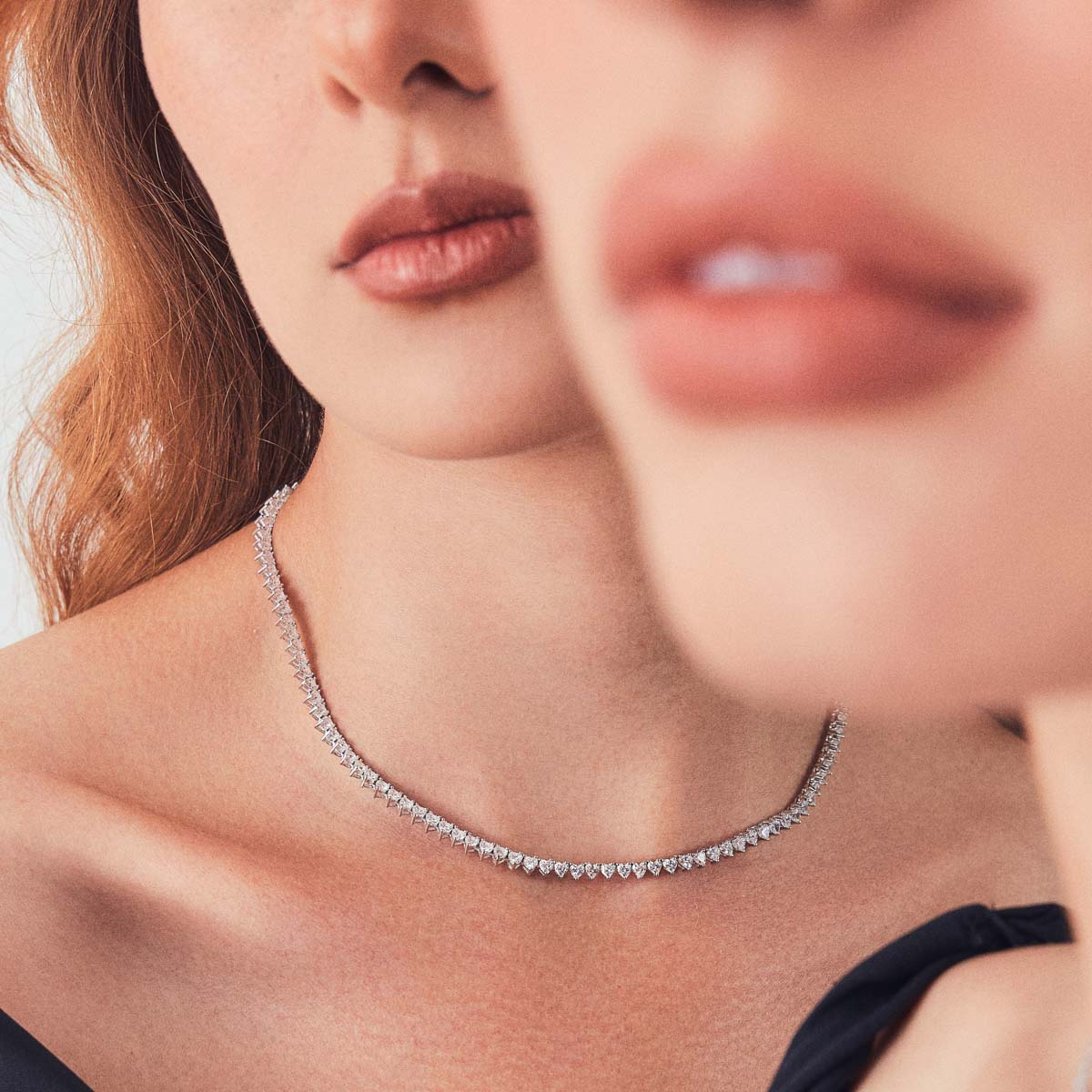 Colar Riviera prata 925 com zircônia cristal em formato de coração, trama rigida e banho de ródio branco, 40cm de comprimento e 3mm de espessura