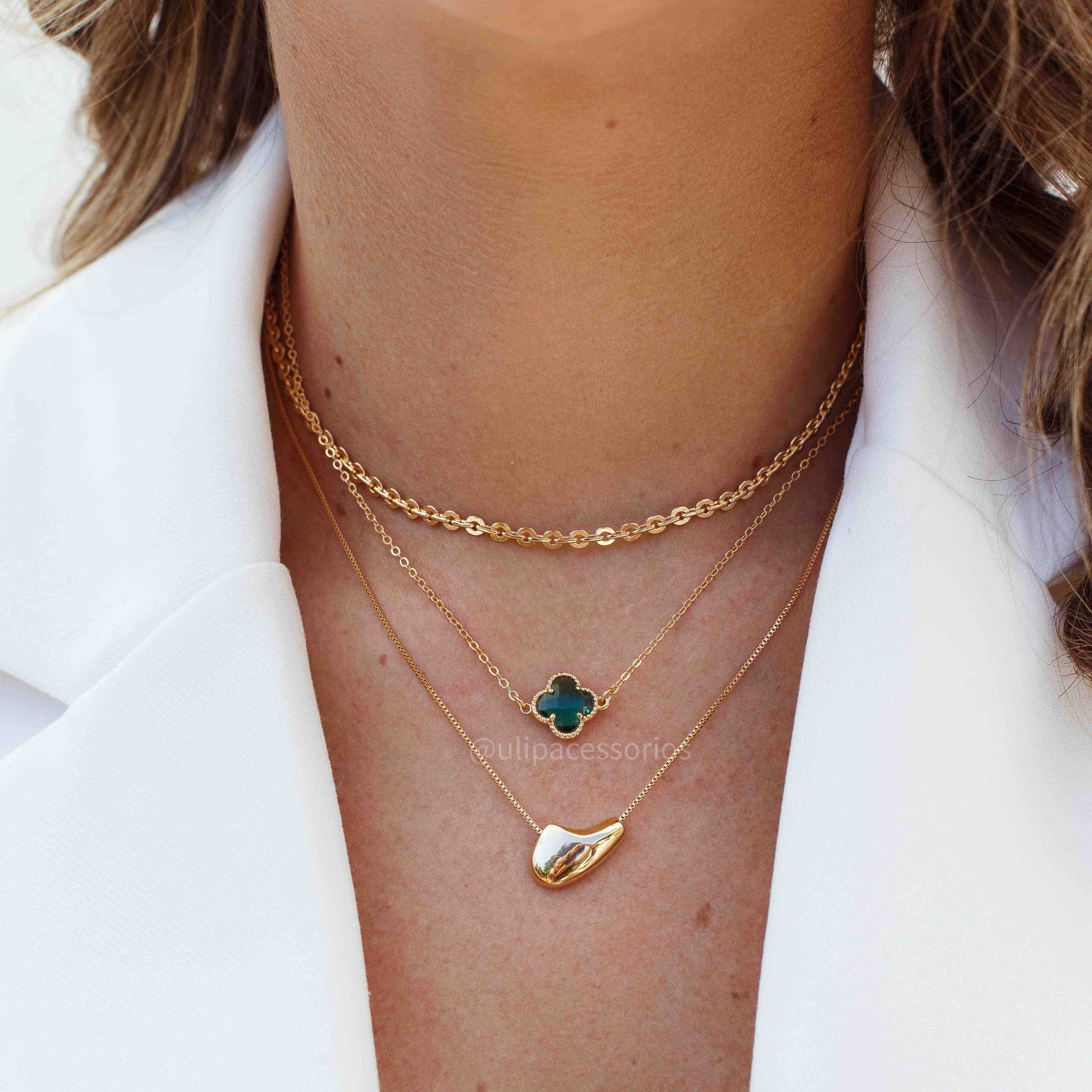 Este colar com pingente de trevo único em esmeralda, banhado a ouro 18k, une elegância e significado em uma peça sofisticada. O banho de ouro realça o brilho da esmeralda, conferindo um toque de luxo e exclusividade. Ideal para quem busca um acessório que simboliza sorte e estilo, perfeito para valorizar qualquer look com delicadeza e charme.