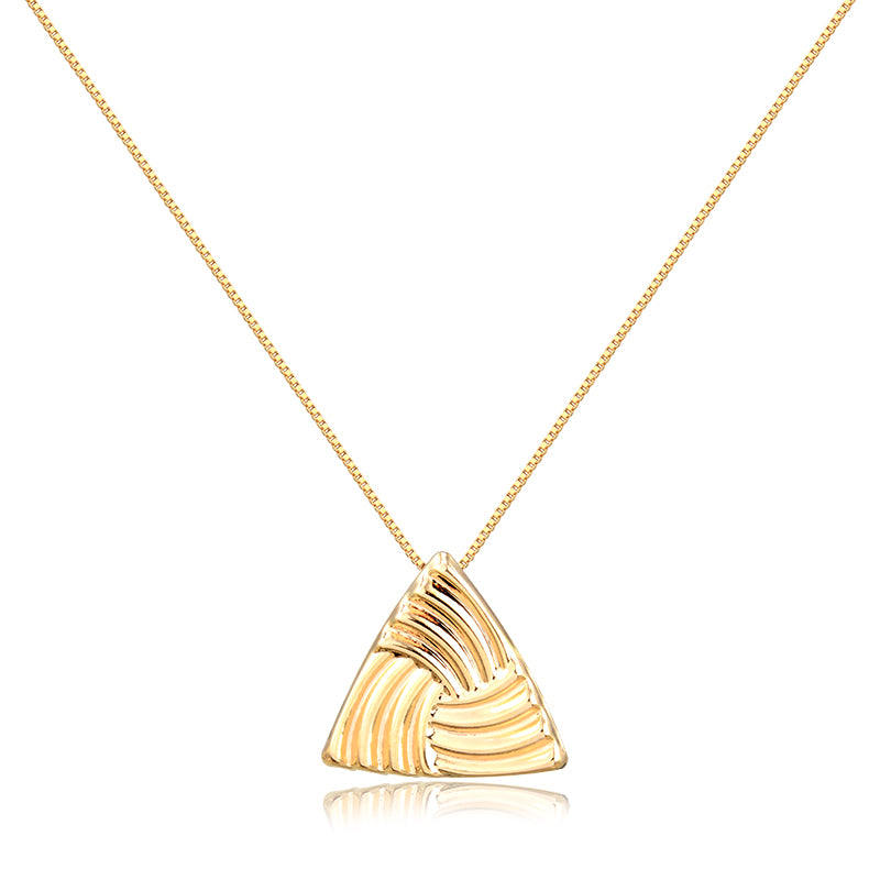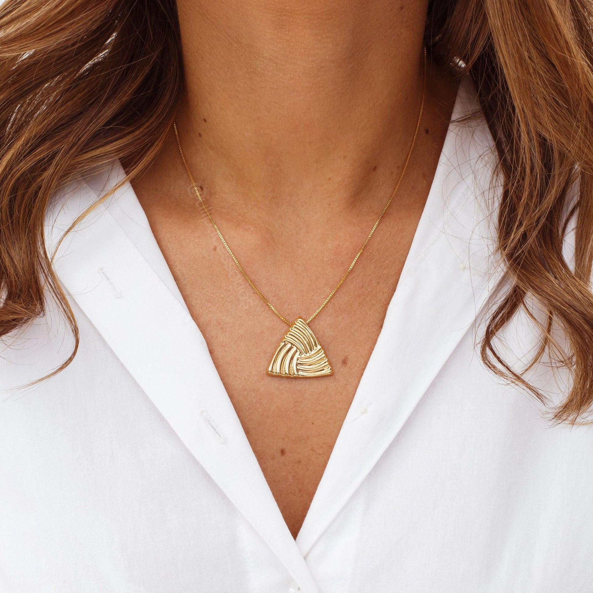 Este colar apresenta um triângulo maior texturizado inspirado no estilo botega, banhado em ouro 18k para um brilho intenso e duradouro. Perfeito para destacar sua elegância e adicionar um toque moderno ao seu visual, ele combina resistência e sofisticação em uma peça única que valoriza qualquer ocasião.