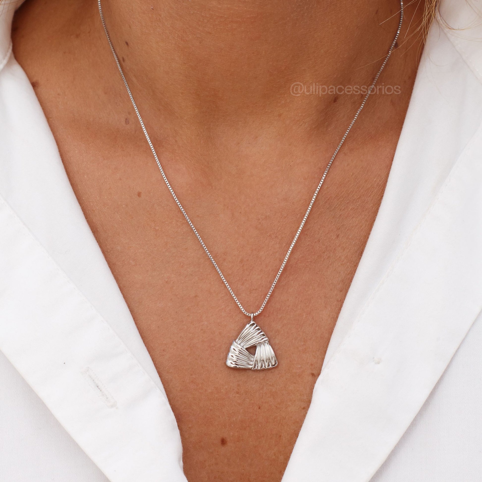 Colar elegante com design triangular trabalhado, finalizado com banho de ródio branco que garante maior durabilidade e brilho duradouro. Perfeito para complementar looks do dia a dia ou ocasiões especiais, trazendo sofisticação com um toque moderno e geométrico ao seu visual.