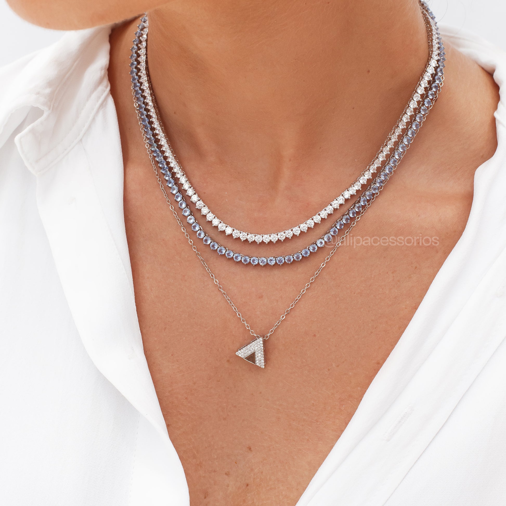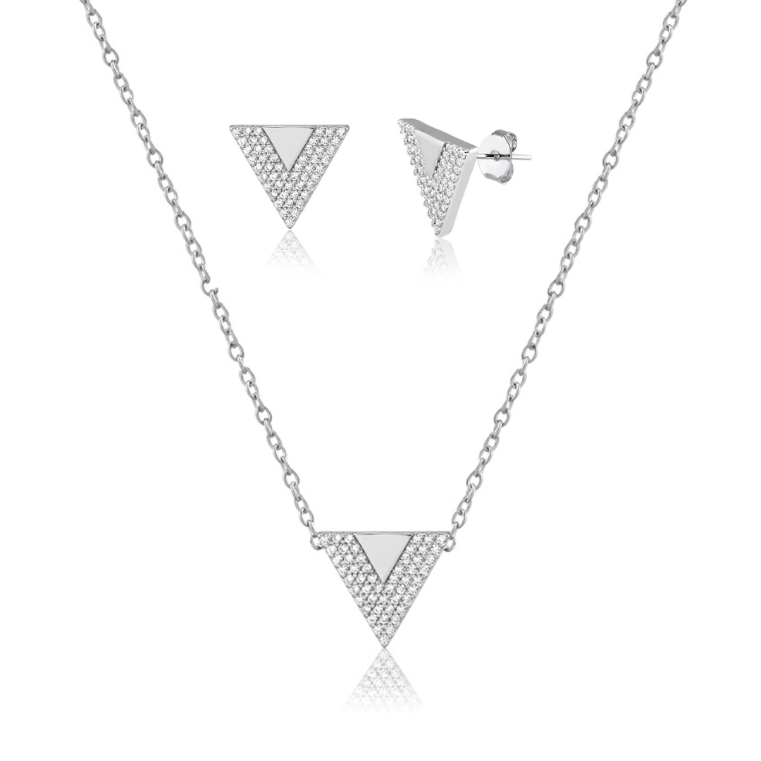 Destaque sua beleza com este conjunto sofisticado de colar e brinco em formato de triângulo, cravejado e banhado em ródio branco. O brilho intenso e o acabamento refinado garantem um visual elegante e moderno, perfeito para valorizar qualquer ocasião com charme e delicadeza. Um acessório indispensável para quem busca estilo e qualidade.
