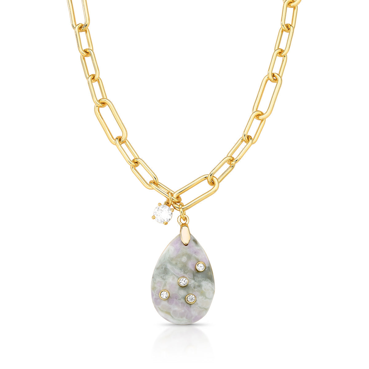 Colar elos longo com pedra agata e pontos de luz e banho de ouro 18k