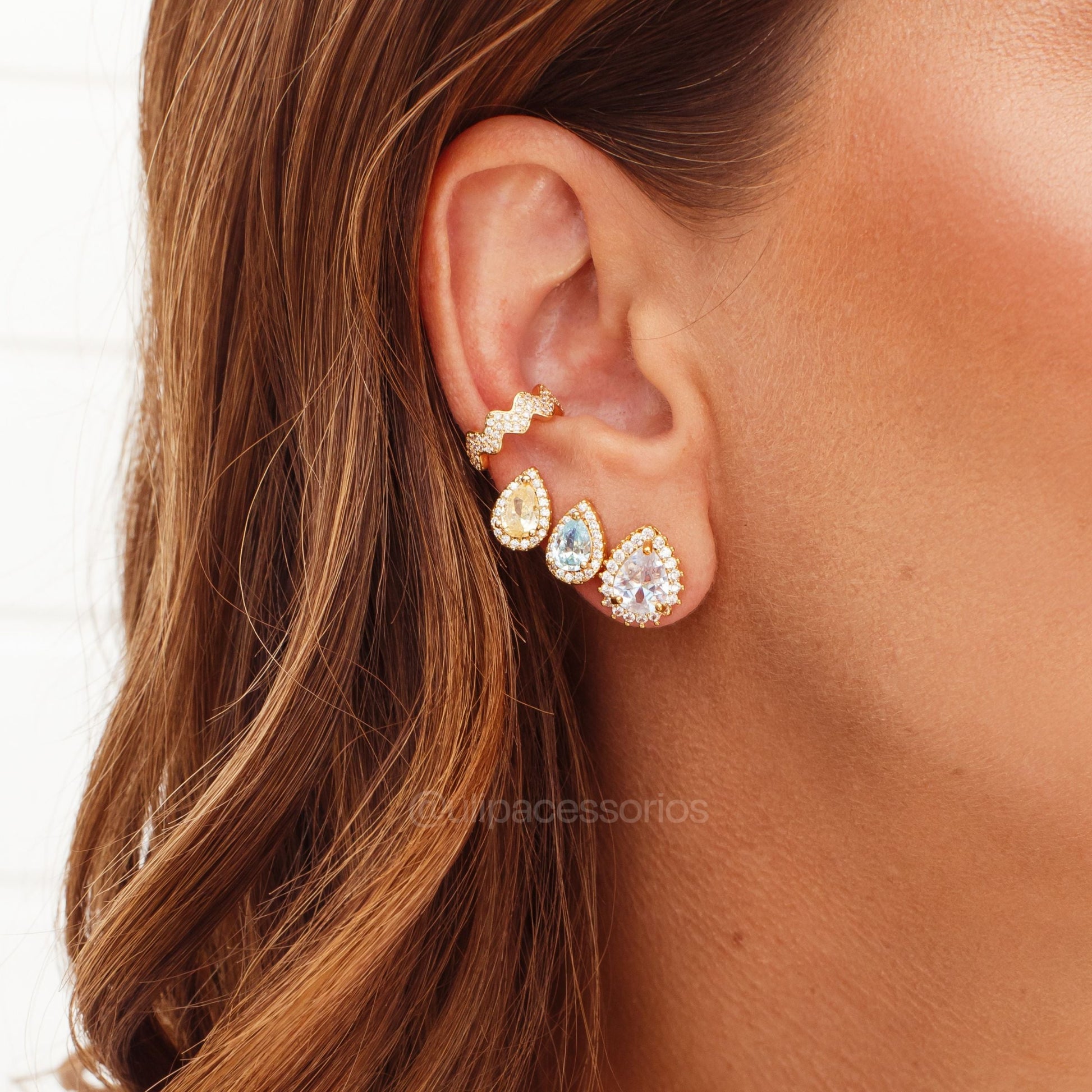 Brinco gota topázio entorno cravejado com banho de ouro 18k