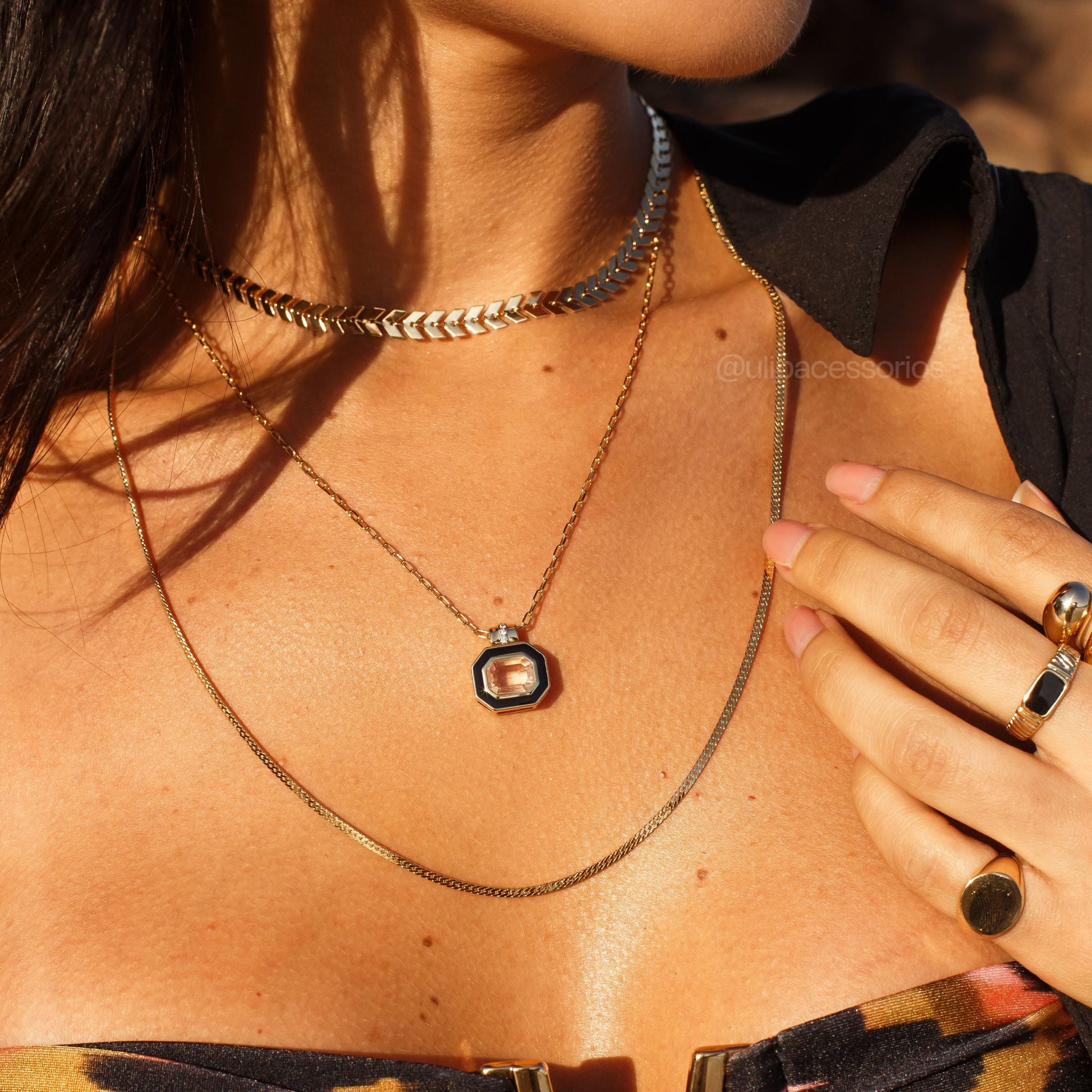 Colar retângulo cristal com resina preta e banho de ouro 18k