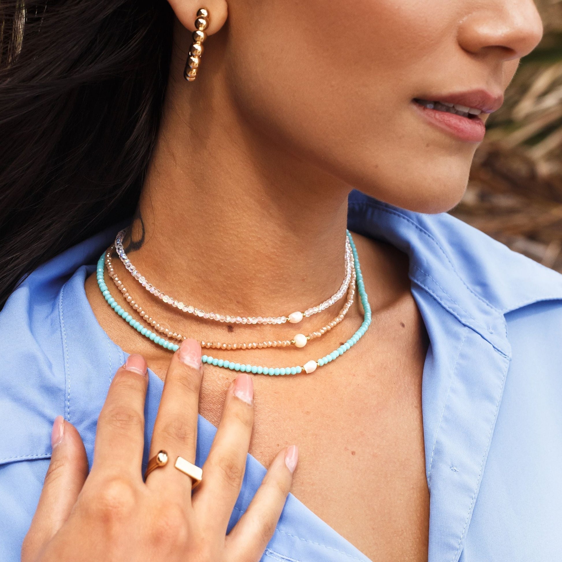 Colar choker cristais turquesa com pérola com banho de ouro 18k