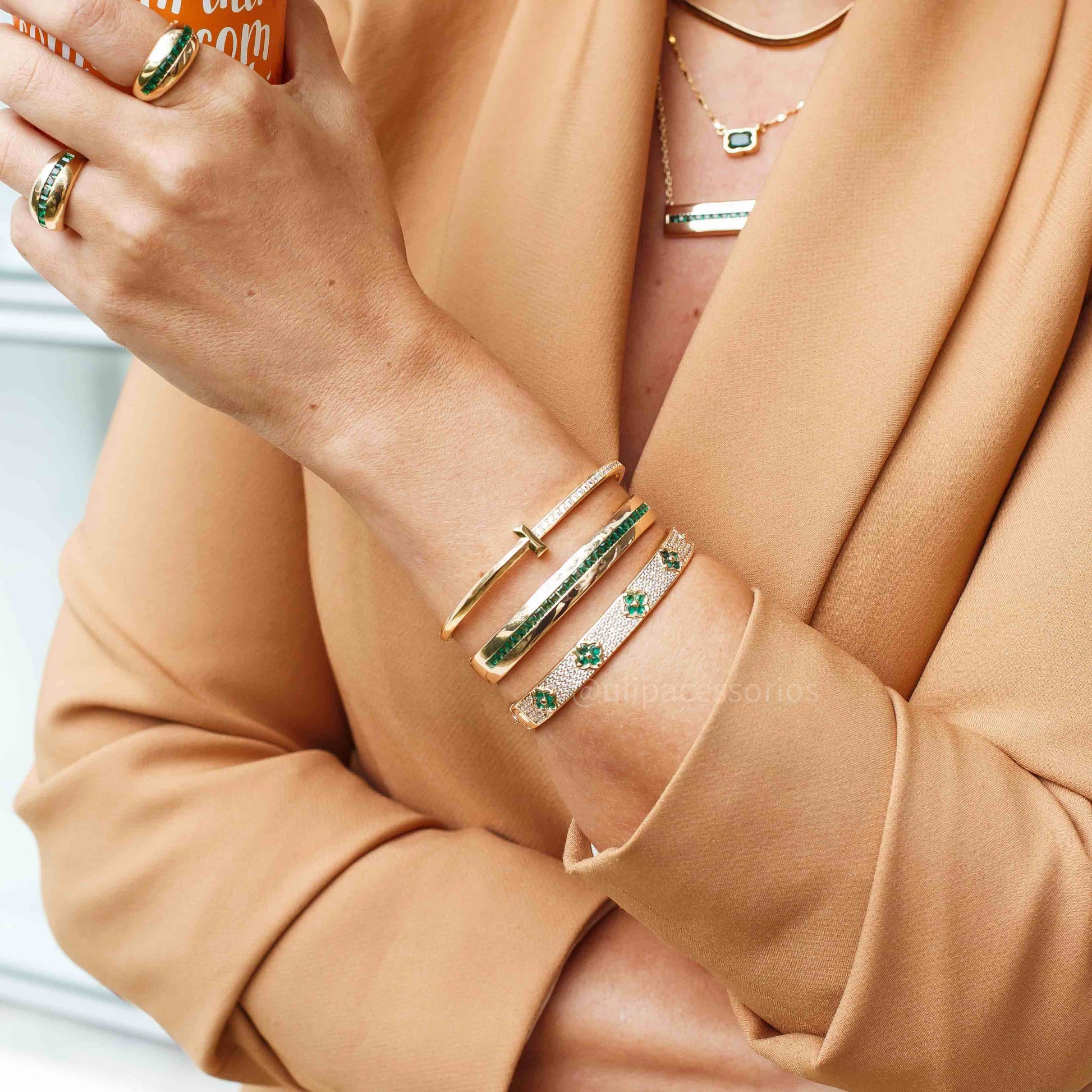 Pulseira bracelete com baguetes de esmeralda e banho de ouro 18k que combina elegância e sofisticação. Os cristais verdes vibrantes destacam-se contra o dourado nobre, criando um visual refinado e atemporal. Perfeita para complementar looks especiais ou usar no dia a dia com estilo. Uma peça versátil que eleva qualquer produção e reflete seu bom gosto. Ideal para quem busca acessórios de qualidade com acabamento premium.