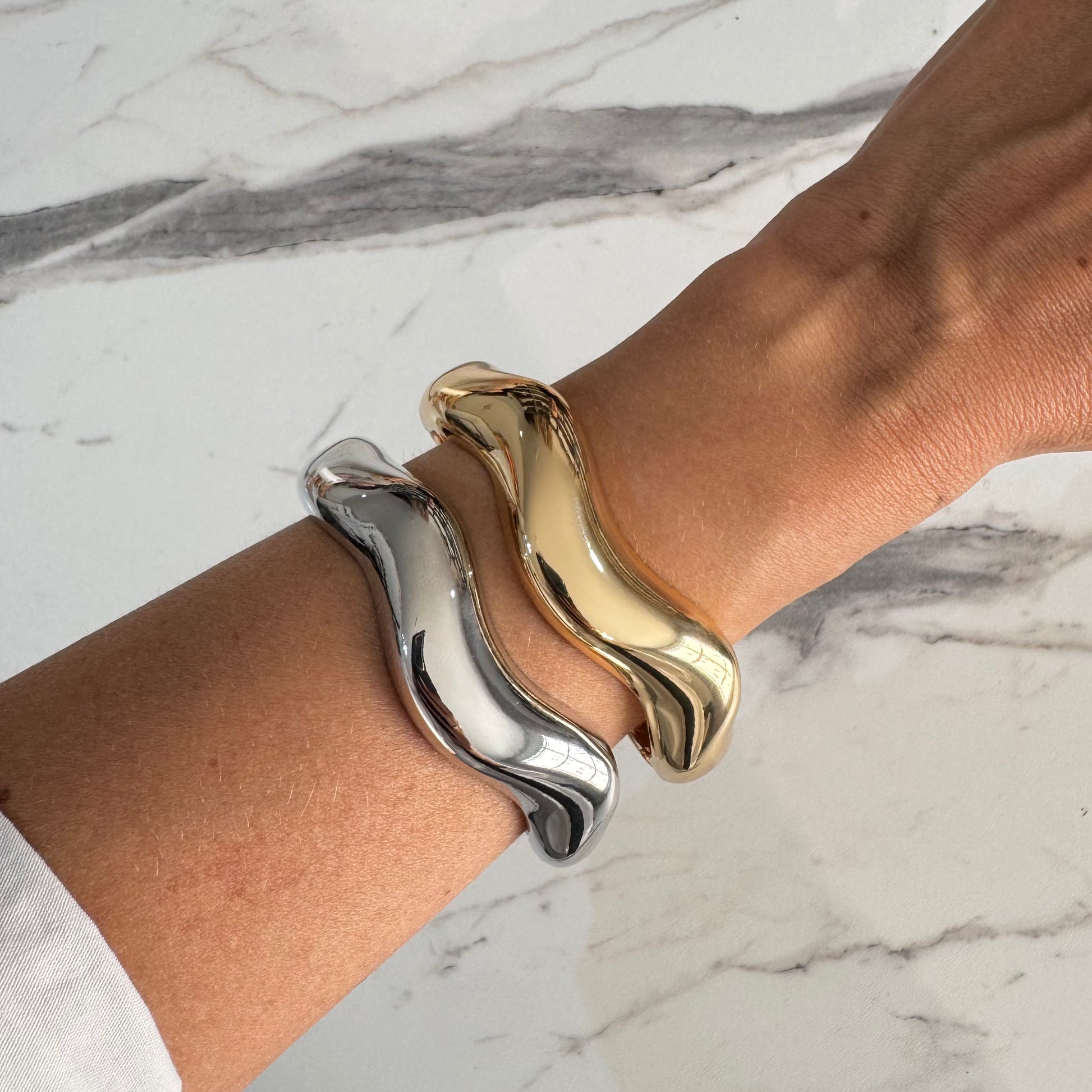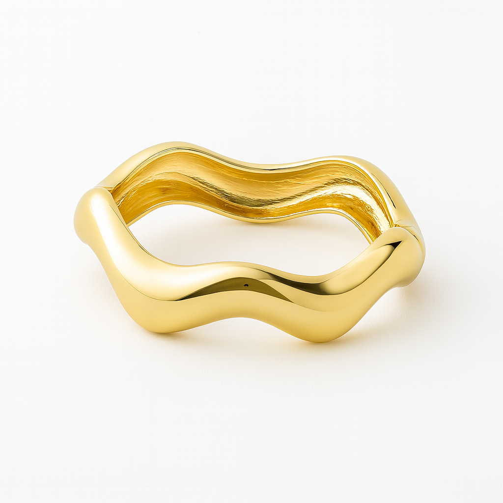 Destaque-se com nossa pulseira bracelete dourada de design ondulado e largura generosa. Este acessório luxuoso abraça seu pulso com elegância, criando um efeito visual impressionante que captura olhares. O acabamento dourado brilhante complementa qualquer produção, desde o casual ao sofisticado, transformando instantaneamente seu visual com um toque de glamour irresistível.