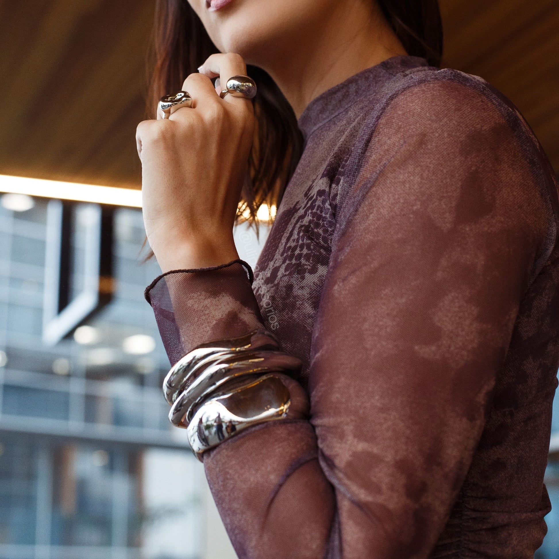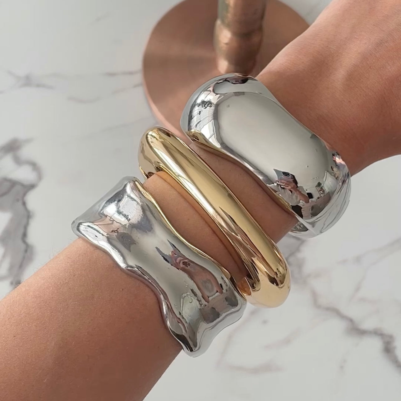 Elegante e moderna, a pulseira bracelete largo orgânico liso com banho de ródio branco é a escolha perfeita para elevar qualquer look. Feita com material orgânico, seu banho de ródio branco confere um brilho duradouro e resistente à pulseira, tornando-a perfeita para acompanhar você em qualquer ocasião.