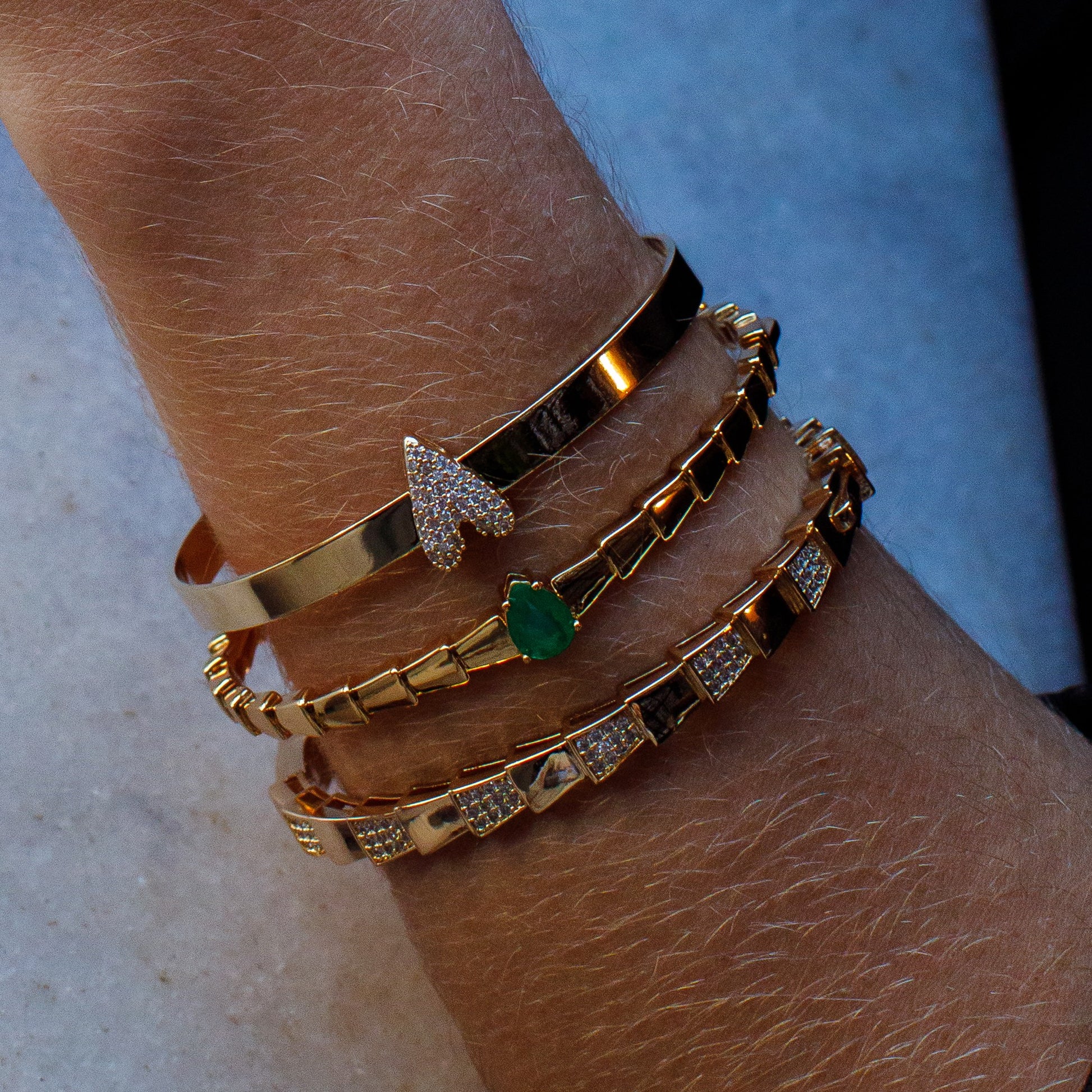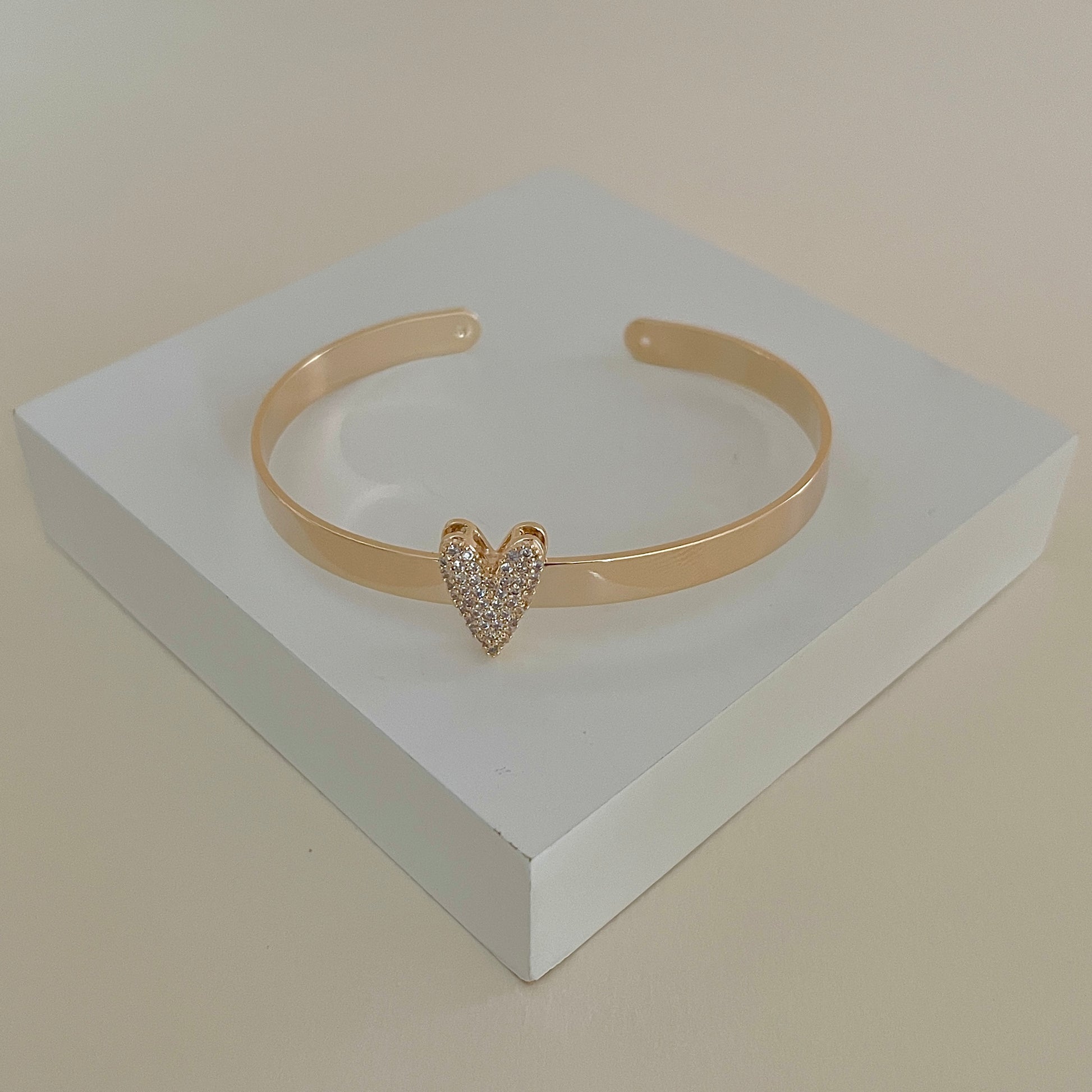 Esta pulseira bracelete lisa, com um delicado coração cravejado, é banhada em ouro 18k, conferindo um brilho intenso e duradouro. Uma peça sofisticada que une romantismo e elegância, perfeita para destacar seu estilo com um toque de luxo e personalidade.