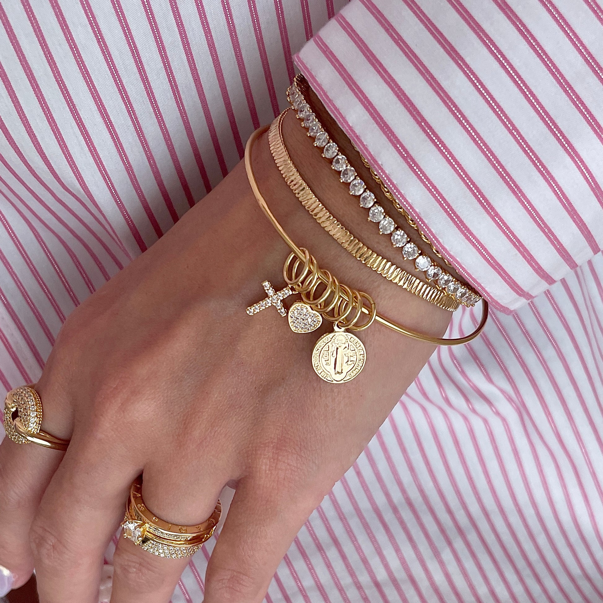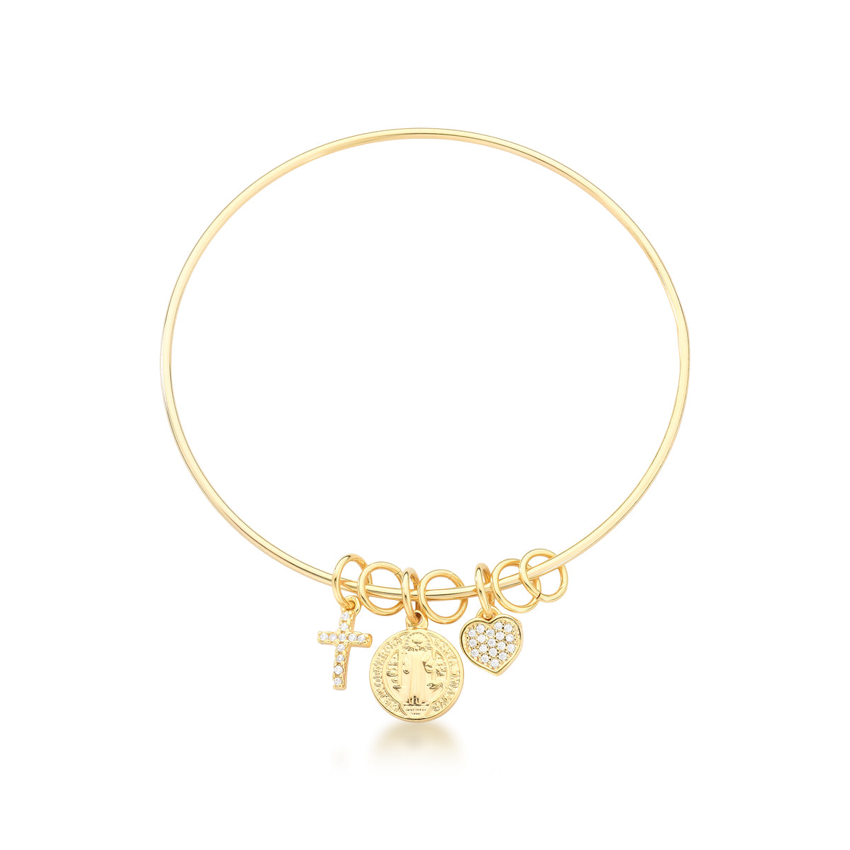Pulseira bracelete pingentes: cruz, medalha e coração com banho de ouro 18k