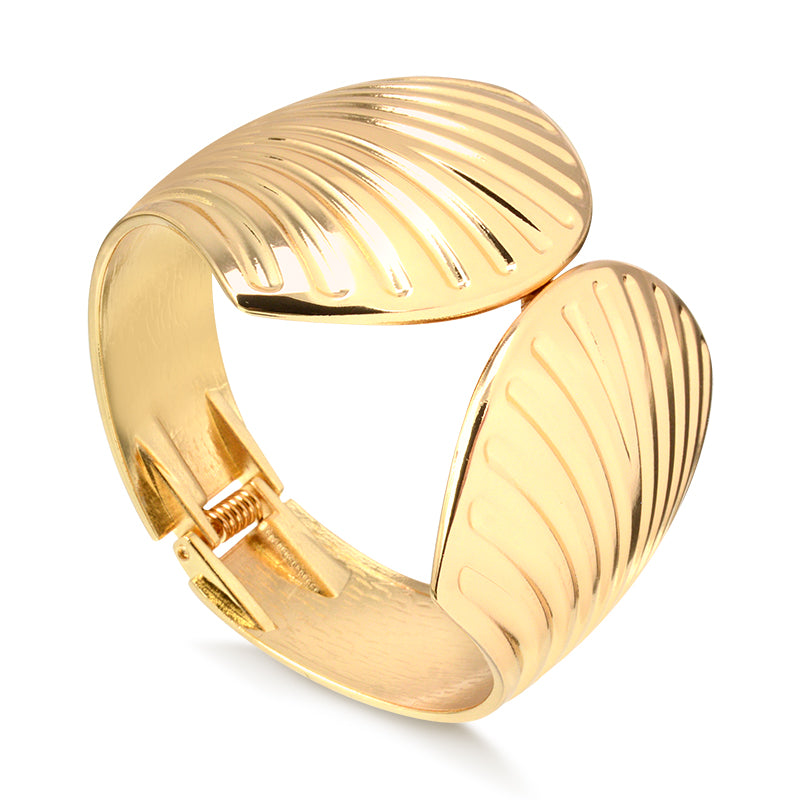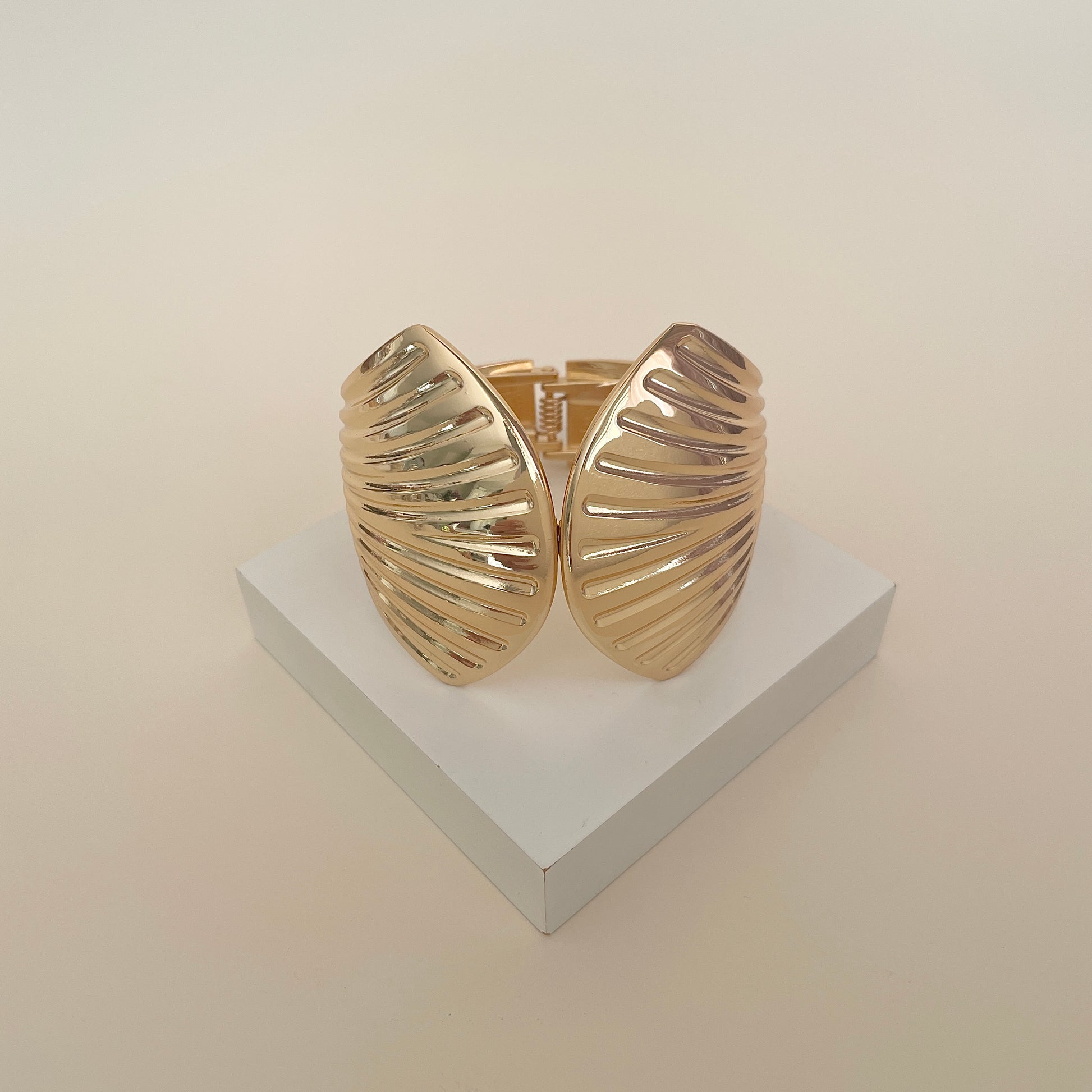 Pulseira maxi bracelete em formato de concha com banho de ouro 18k que abraça elegantemente o punho. Peça imponente e estilosa, perfeita para quem busca um acessório que faz declaração. O design generoso e sofisticado transforma qualquer look, agregando luxo e personalidade ao seu estilo. Um bracelete que combina conforto com presença marcante.