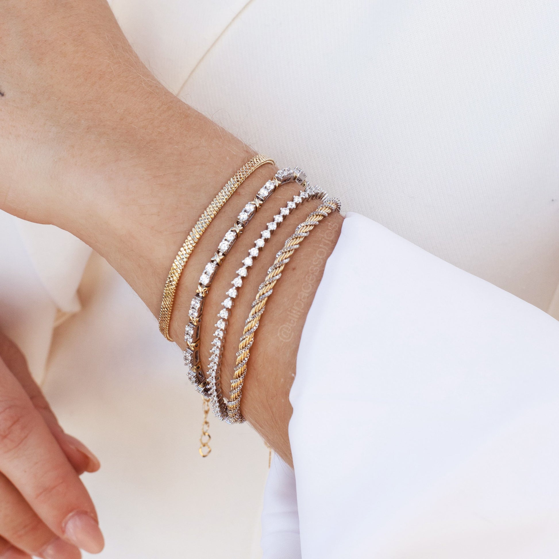 Esta pulseira Riviera em prata 925 com detalhe em X dourado une elegância e modernidade, realçando seu estilo com um toque sofisticado. Seu design delicado e acabamento impecável garantem um acessório versátil, perfeito para valorizar qualquer look, do casual ao formal. Invista em uma peça que destaca sua personalidade com brilho e exclusividade.